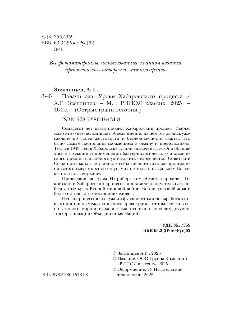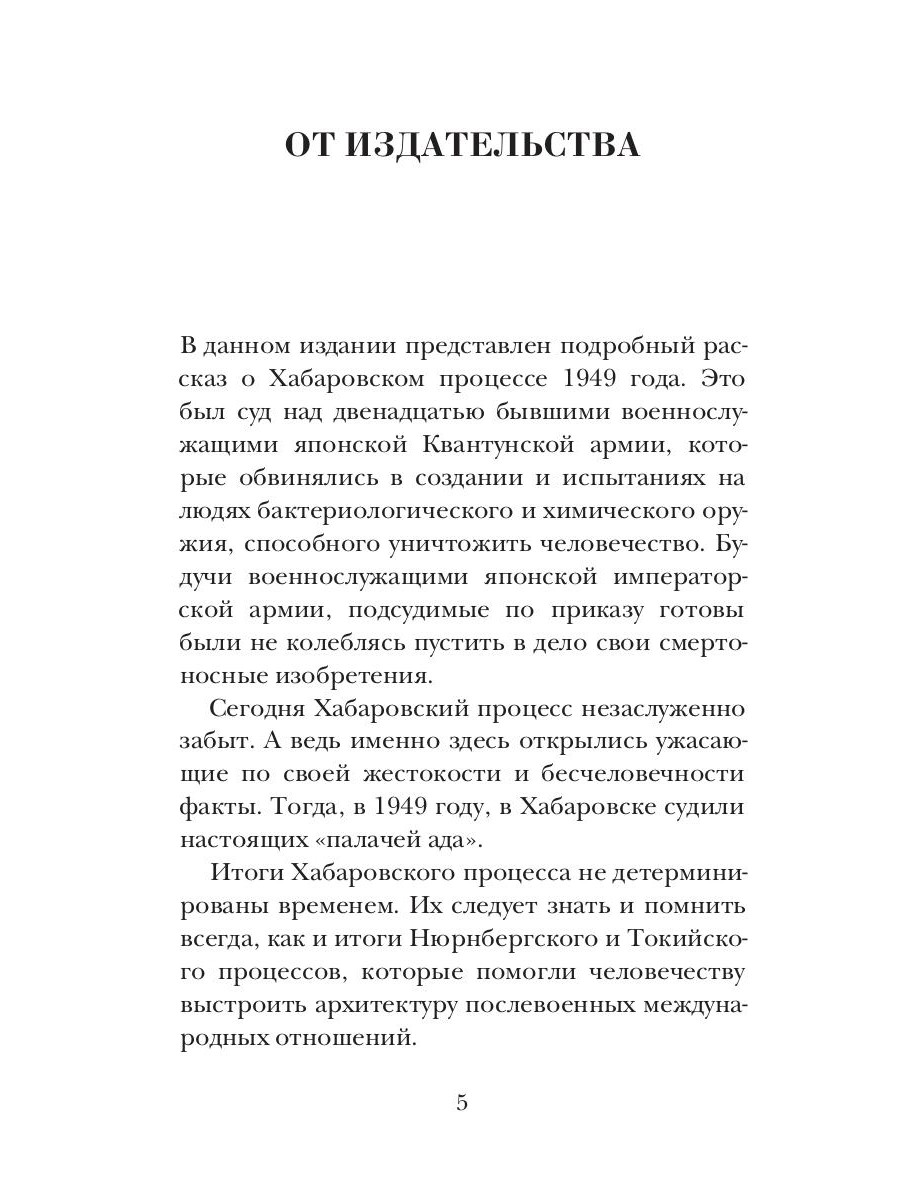 Семьдесят лет назад прошел Хабаровский процесс. Сейчас мало кто о нем вспоминает. А ведь именно на нем открылись ужасающие по своей жестокости и бесчеловечности факты. Это было самым настоящим схождением в бездну и преисподнюю. Тогда в 1949 году в Хабаровске судили «палачей ада». Они обвинялись в создании и применении бактериологического и химического оружия, способного уничтожить человечество. Советский Союз приложил все усилия, чтобы не допустить распространения этого смертоносного «пунами» не только на Дальнем Востоке, но и по всему миру. Прошедшие вслед за Нюрнбергским «судом народов», Токийский и Хабаровский процессы поставили окончательную, победную точку во Второй мировой войне. Войне, унесшей жизни более 50 миллионов человек. Итоги процессов послужили фундаментом для выработки новых принципов международного правосудия, которые легли в основу нового миропорядка, а также основополагающих документов Организации Объединенных Наций.| Издательство | Рипол Классик |