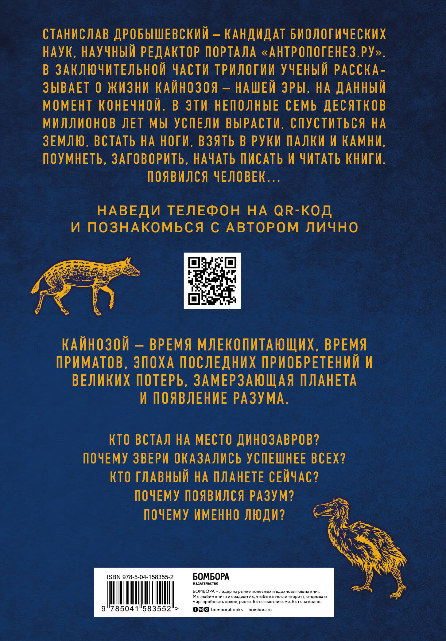 Заключительная часть трилогии «Палеонтология антрополога» известного российского популяризатора науки Станислава Дробышевского расскажет о появлении разума, о том, как за неполные семь десятков миллионов лет мы успели вырасти, спуститься на землю, встать на ноги, взять в руки палки и камни, поумнеть, заговорить, начать писать и читать книги, и как появился Человек... «Мы живём в окружении других людей, мы постоянно видим вокруг себя людей и не замечаем никого другого. Мы живём на планете людей. Но мы зависим от бактерий, водорослей, растений, грибов, простейших, насекомых, рыб, птиц, грызунов и множества иных существ. Миллиарды связей за миллиарды лет скрепили биосферу в единое целое. Мы не можем жить вне биосферы, мы её часть. Пока мы справляемся не очень здорово: в немалой степени из-за нас по планете идёт массовое вымирание, но надо стараться и исправляться, не зря же мы сами гордо назвали себя "разумными". Наша задача - постараться не разрушить нашу среду обитания, как минимум - сохранить жизнь, а может, и расселить её в иные миры».| Издательство | ООО "Издательство "Эксмо" |