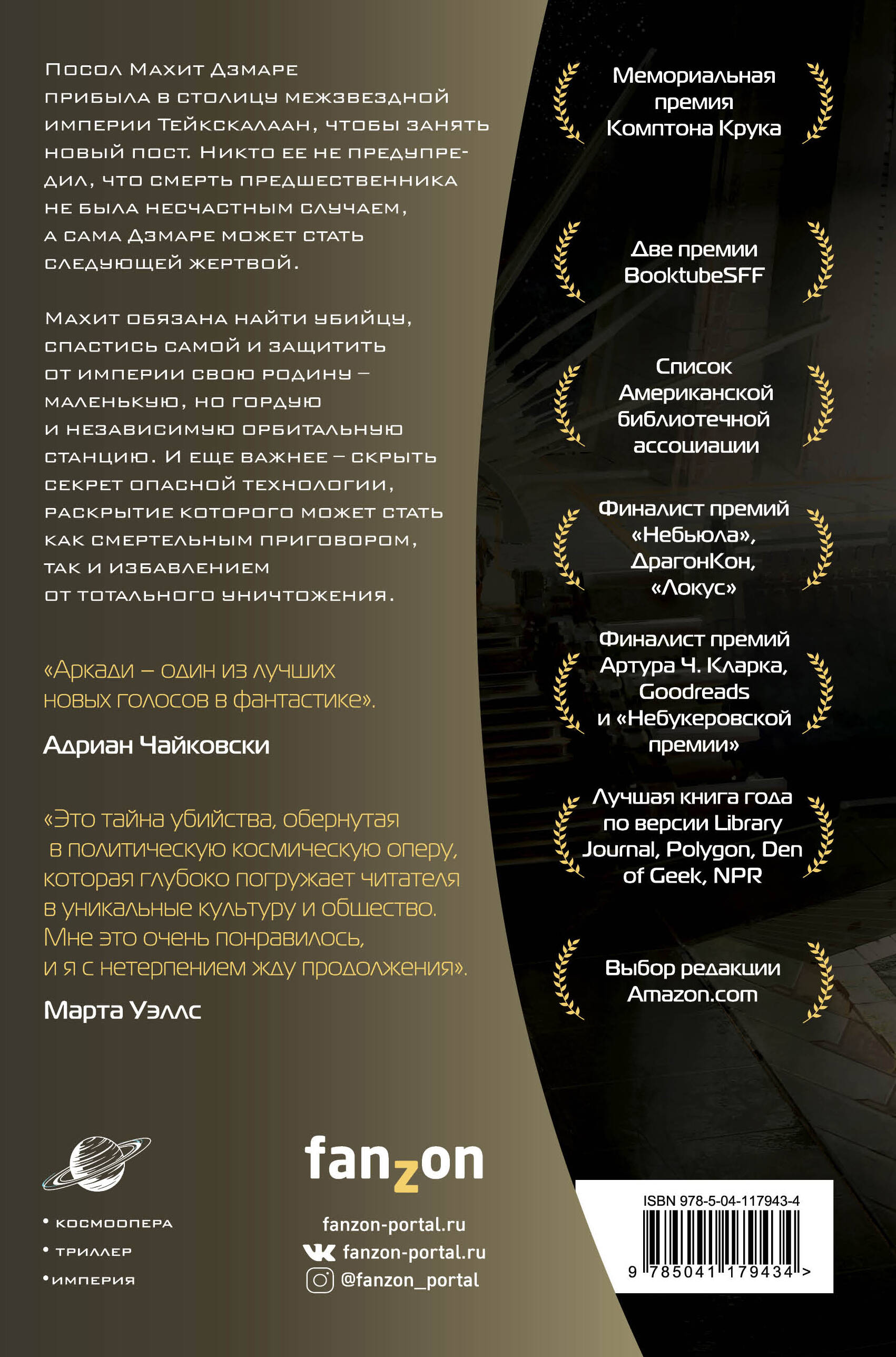 Лауреат премии «Хьюго» 2020 года в категории «Лучший роман». Империя Тейкскалаан вызывает с космической станции Лсел нового посла. Теперь Махит Дзмаре предстоит отстаивать независимость станционников. Вживленная в мозг Махит память прежнего посла должна помочь ей в дипломатических битвах с имперцами, только вот имаго-аппарат внезапно выходит из строя, и Махит придется распутывать клубок интриг предшественника самостоятельно. Империя, пронизанная традиционным поэтическим этикетом, меняет все, чего коснется. Она готова перемолоть дерзкую варварку, но Махит не так проста, чтобы сдаться. «Завораживающий дебют... он оставил меня совершенно ослепленным». - The New York Times Book Review «Великолепно созданная дипломатическая космическая опера... Читатели с нетерпением ждут запланированные сиквелы к этому впечатляющему дебюту». - Publishers Weekly «Политика и персонажи смешиваются с захватывающим сеттингом и изящной прозой в дебюте, который сплетает нити идентичности, ассимиляции, технологии и культуры, чтобы создать очень качественный политический научно-фантастический триллер». -Library Journal «Это одновременно эпическая и человеческая история в стиле Энн Леки и Юн Ха Ли». - Kirkus «Изысканное... захватывающее путешествие с богатым миром и увлекательными персонажами». - The Los Angeles Times «Интересно, подробно, богато». - The Wall Street Journal «Роман прекрасно уравновешивает экшен и интригу с вопросами империи и идентичности. Все связано блестящей космической оперой, я просто обожаю ее». - Энн Леки «Потрясающий научно-фантастический дебют. Посол с маленькой космической станции должен выжить в столице галактической империи, где все, кажется, хотят ее смерти… Потрясающе». - Рик Риордан «Изящный и совершенный пример жанра тайных интриг на фоне звезд. Восхитительное чтение. Я не мог оторваться». - Джо Уолтон «Аркади ― один из лучших новых голосов в фантастике». - Адриан Чайковски «Напряженная тайна убийства, вплетенная в вопросы технологической этики, и вызывающее воспоминания изображение чуждости. Мартин создает сложную и привлекательную культуру, на фоне которой разыгрывается эта история, полная политических интриг, ассимиляции и сопротивления. Смелая, красивая, захватывающая и глубокая книга». - Малка Олдер «Это тайна убийства, обернутая в политическую космическую оперу, которая глубоко погружает читателя в уникальные культуру и общество. Мне это очень понравилось, и я с нетерпением жду продолжения». - Марта Уэллс «Хитро спланированная, богатая и продуманная история о межзвездных интригах, которая вносит нечто новое в космическую оперу». - Кен Маклеод «Роман поднимает космооперу до поэзии ― умной, глубокой, иногда трагической, иногда жестокой, всегда трансцендентной поэзии, которая сияет, как лезвие ножа». - Делия Даусон «Запутанная, многослойная история империи, личных амбиций, политических обязательств и межзвездных интриг. Яркий и восхитительно изобретательный дебют». - Алиетта де Бодар «Лучший научно-фантастический роман, который я прочитала за последние пять лет». - Юн Ха Ли «Исключительный роман, рекомендованный поклонникам Иэна М. Бэнкса, Айзека Азимова, Кэролайн Черри и Энн Леки». - Элизабет Беар «Книга чертовски хороша. Это похоже на космическую оперу с таинственным убийством в сочетании со всеми политическими частями "Дюны"». - Дэн Уэллс| Издательство | ОО