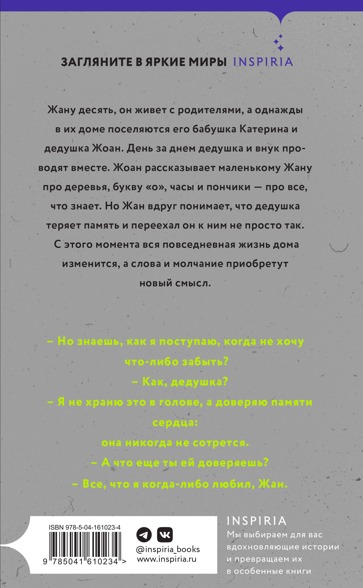 - В первую очередь память, а вслед за ней уйду и я. Метафоричная проза о взрослении и старости, о связи поколений и каталонской культуре глазами ребенка, открывающего для себя мир и историю семьи. Жану 10, он живет с родителями в Барселоне. Его бабушка Катерина и дедушка Жоан переезжают в их дом. День за днем дедушка и внук проводят вместе. Он рассказывает маленькому Жану про деревья, букву «о», часы и пончики, про все, что он знает. Но Жан вдруг понимает, что дедушка теряет память и переехал он не просто так. С этого момента вся повседневная жизнь дома изменится, слова и молчание приобретут новый смысл.
