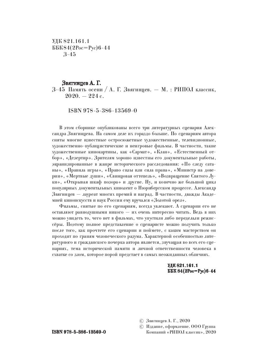 В этом сборнике опубликованы всего три литературных сценария Александра Звягинцева. На самом деле их гораздо больше. По сценариям автора сняты многие известные остросюжетные художественные, телевизионные, художественно-публицистические и неигровые фильмы. В частности, такие художественные кинокартины, как "Сармат", "Клан", "Естественный отбор", "Дезертир". Зрителям хорошо известны его документальные работы, экранизированные в жанре исторического расследования: "По следу сатаны", "Правила игры", "Право силы или сила права", "Министр на доверии", "Мертвые души", "Свинцовая оттепель", "Возвращение Святого Луки", "Открывая шкаф позора" и другие. Ну, и конечно же большой цикл популярных документальных кинолент о Нюрнбергском процессе. Александр Звягинцев - лауреат многих премий и наград. В частности, дважды Академией киноискусств и наук России ему вручался "Золотой орел". Фильмы, снятые по его сценариям, всегда увлекают. А сценарии его не оставляют равнодушными никого - их очень интересно читать. Ведь в них можно увидеть то, чего нет в фильмах, что упустили либо переделали режиссёры. Поэтому полное представление о сценаристе можно получить только после того, как прочтете его сценарии и поймете, с каким мастерством он проходит по граням человеческого разума. Характерной особенностью литературного и гражданского почерка автора является, звучащая во всех его сценариях, тема исторической памяти и личной ответственности человека в схватке со злом, которое порой предстает в самых неожиданных обличиях.| Издательство | Омега-Л |