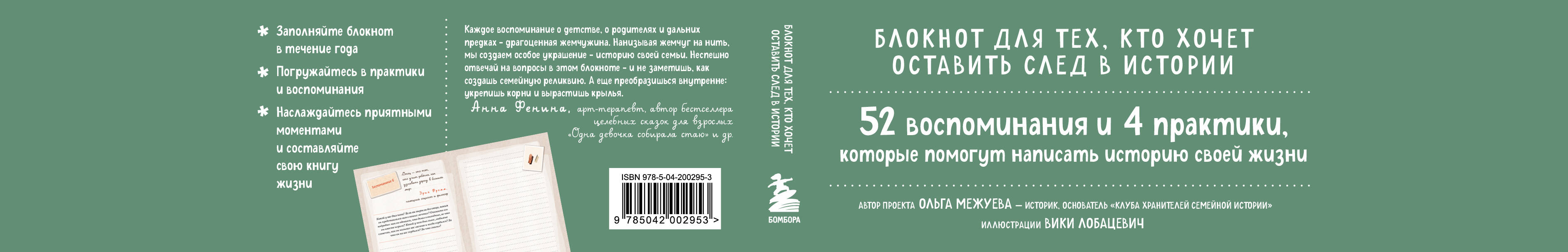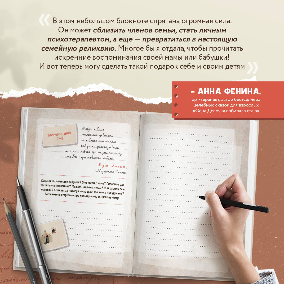 Уникальная методика работы с воспоминаниями от Ольги Межуевой - историка и основателя Клуба «Хранителей семейной истории». В блокноте вы найдете 52 вопроса, которые рассчитаны на год. С их помощью сможете оживить самые приятные воспоминания о детстве и близких людях. С его помощью вы сможете: - очутиться в прошлом и достать оттуда самые приятные моменты; - сделать подарок себе и своим детям, создав настоящую семейную реликвию. «Память сердца» станет настоящим мостиком между поколениями, который объединит вашу семью и поможет сохранить самые ценные моменты вашей жизни и ваших близких. «В этом небольшом блокноте спрятана огромная сила. Он может сблизить членов семьи, стать личным психотерапевтом, а еще - превратиться в настоящую семейную реликвию. Многое бы я отдала, чтобы прочитать искренние воспоминания своей мамы или бабушки! И вот теперь могу сделать такой подарок себе и своим детям». - Анна Фенина, арт-терапевт, автор бестселлера целебных сказок для взрослых «Одна Девочка собирала стаю» и др.| Издательство | ООО "Издательство "Эксмо" |