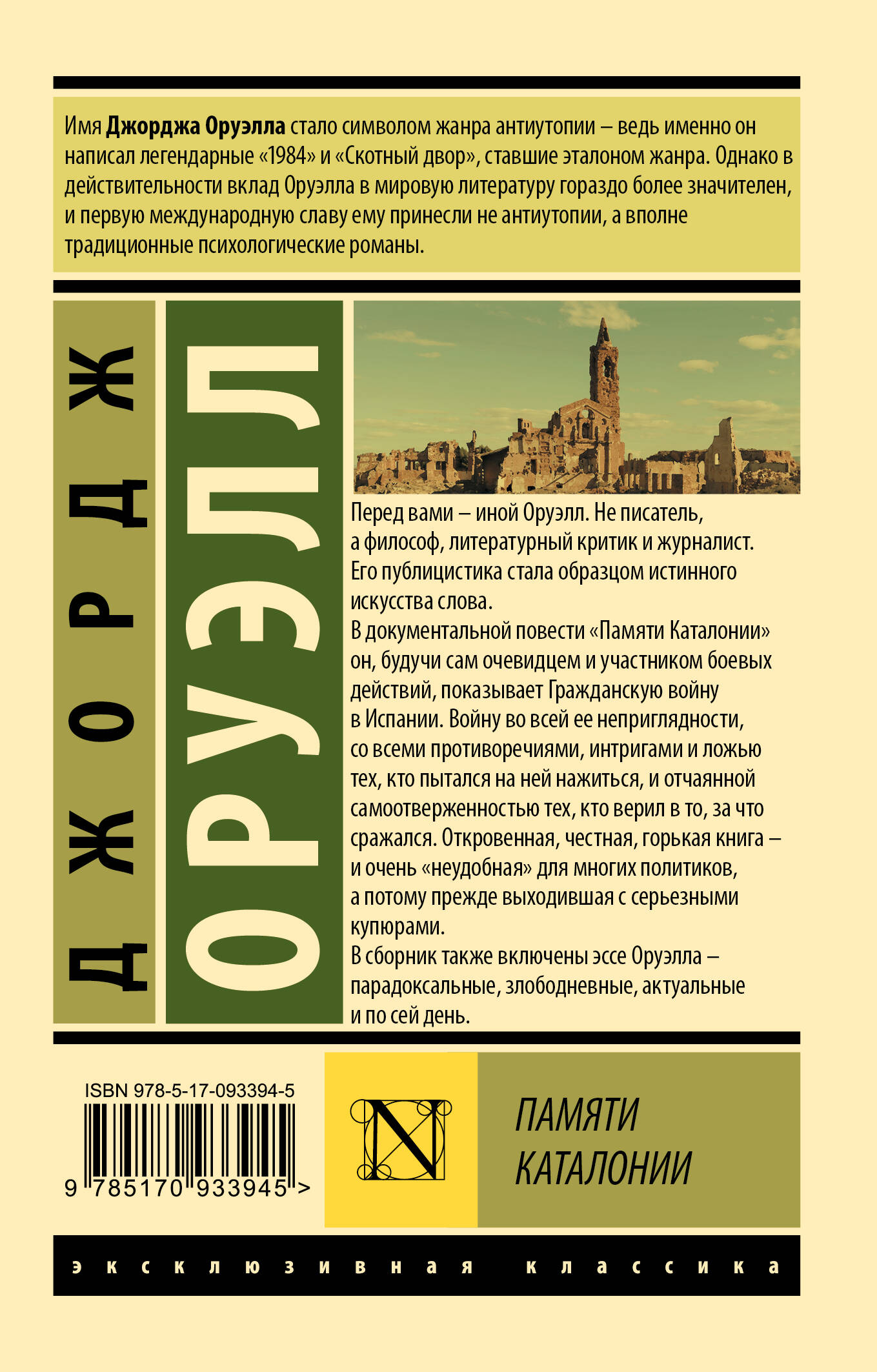 В документальной повести «Памяти Каталонии» он, будучи сам очевидцем и участником боевых действий, показывает Гражданскую войну в Испании. Войну во всей ее неприглядности, со всеми противоречиями, интригами и ложью тех, кто пытался на ней нажиться, и отчаянной самоотверженностью тех, кто верил в то, за что сражался. Откровенная, честная, горькая книга - и очень «неудобная» для многих политиков, а потому прежде выходившая с серьезными купюрами. В сборник также включены эссе Оруэлла - парадоксальные, злободневные, актуальные и по сей день.