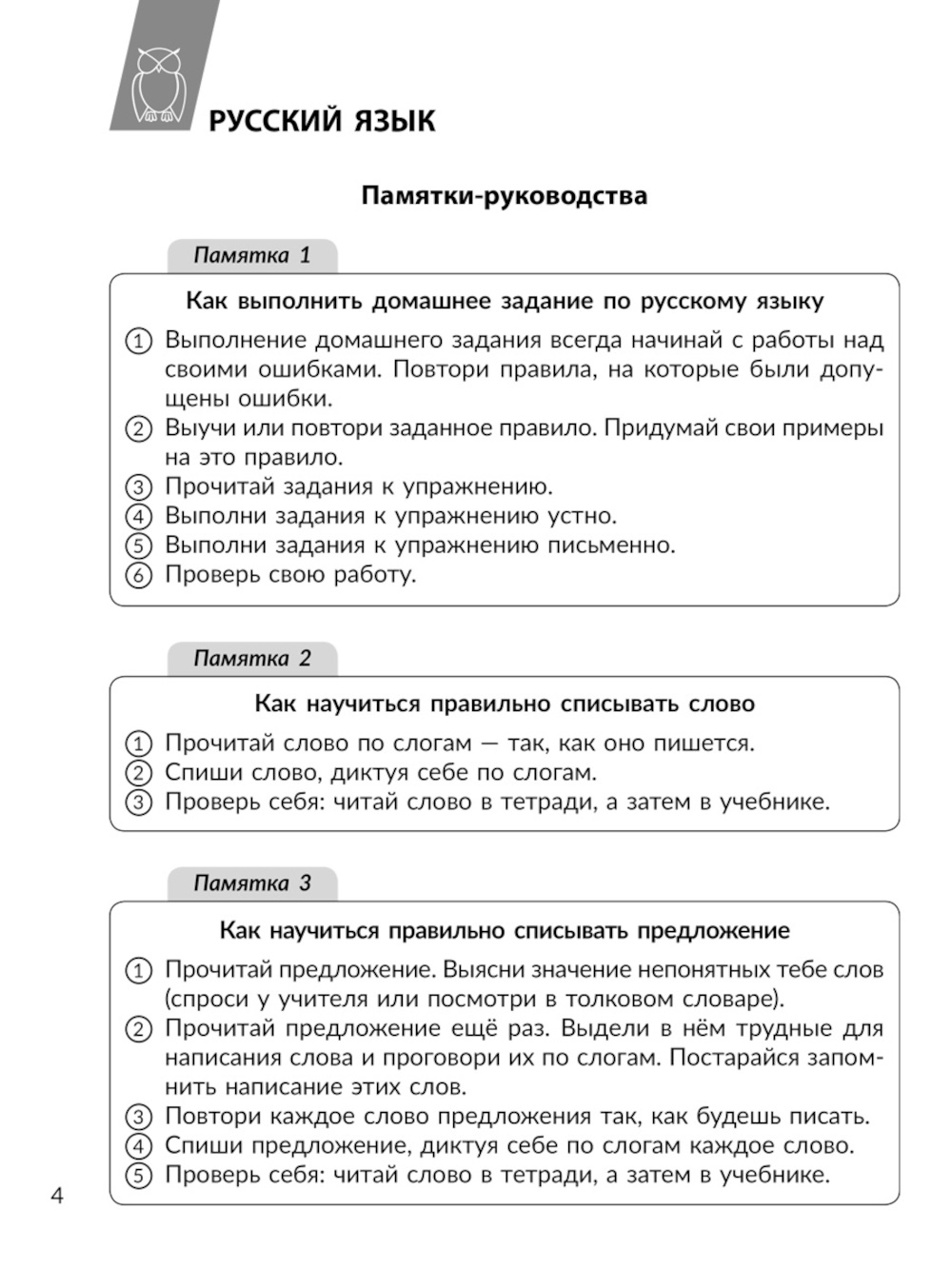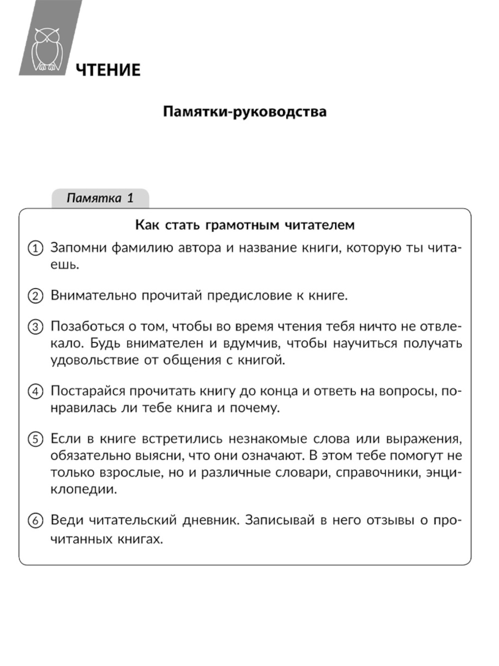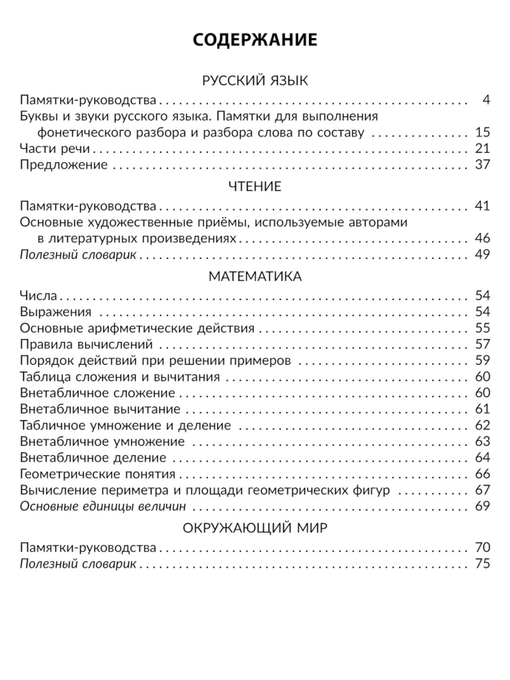 В книге приведены самые важные учебные материалы по основным школьным предметам: русскому языку, чтению, математике и окружающему миру. Материалы представлены в виде памяток, необходимых школьнику на рабочем столе ежедневно. Памятки-руководства подскажут ученику алгоритмы выполнения самых различных заданий учителя. Они помогут выполнить фонетический разбор слова и решить задачу, вспомнить правила русского языка и дать характеристику природной зоне - эти и многие другие полезные подсказки будут отличными помощниками в школе и дома, в выполнении домашних заданий и в подготовке к контрольным работам. В разделах «Чтение» и «Окружающий мир» есть также полезные для ребёнка словарики, в которые включены основные понятия, изучаемые учебной программой. Пособие адресовано младшим школьникам.| Издательство | ИД ЛИТЕРА |