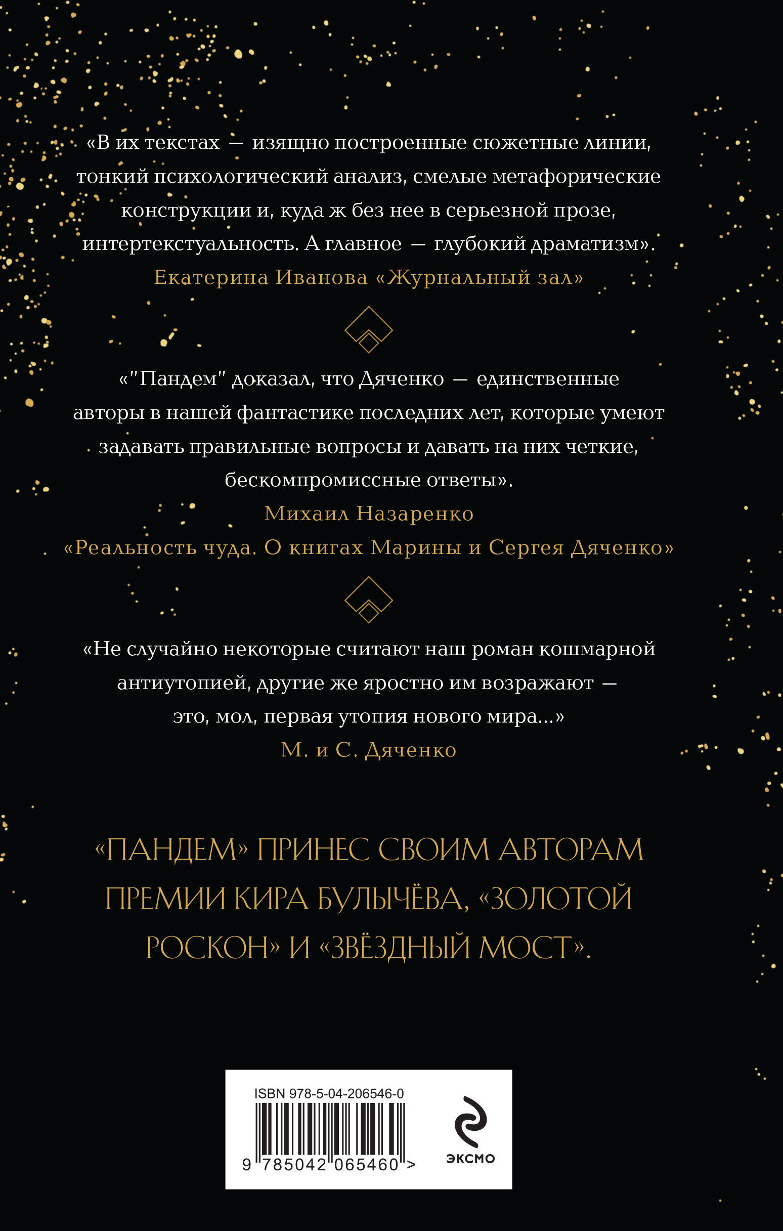 1. Один из самых известных романов от авторов, чьи книги переведены на многие языки мира. Марина и Сергей Дяченко стали лауреатами более 100 премий, отечественных и международных. На общеевропейской конференции фантастов ЕВРОКОН-2005 в Глазго они были признаны лучшими фантастами Европы. 2. По оригинальным сценариям М. и С. Дяченко сняты такие блокбастеры, как «Он - дракон», «Темный мир. Равновесие». 3. «Пандем» принес авторам победу в премии «Золотой РосКон-2004», «Звёздный мост-2003», премии Кира Булычёва в 2004 году, был удостоен диплома Литературной премии имени Аркадия и Бориса Стругацких, а также номинировался на АБС-премию, премию «Русская фантастика», «Бронзовая улитка», «Интерпресскон». 4. Сложные философские вопросы, небывалый размах и эпичность повествования, тонкий психологизм ставят этот роман-полифонию в один ряд с самыми выдающимися произведениями классиков жанра. 5. Правильно заданные вопросы иногда важнее ответов…| Издательство | ООО "Издательство "Эксмо" |