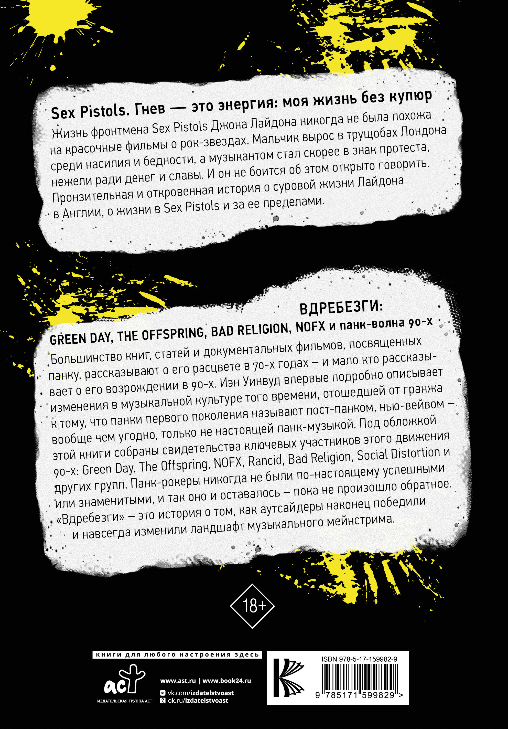 Sex Pistols. Гнев - это энергия: моя жизнь без купюр Жизнь фронтмена Sex Pistols Джона Лайдона никогда не была похожа на красочные фильмы о рок-звёздах. Мальчик вырос в трущобах Лондона среди насилия и бедности, а музыкантом стал, скорее, в знак протеста, нежели ради денег и славы. И он не боится об этом открыто говорить. Пронзительная и откровенная история о суровой жизни Лайдона в Англии, о жизни в Sex Pistols и за её пределами. Вдребезги: GREEN DAY, THE OFFSPRING, BAD RELIGION, NOFX и панк-волна 90-х Большинство книг, статей и документальных фильмов, посвященных панку, рассказывают о его расцвете в 70-х годах - и мало кто рассказывает о его возрождении в 90-х. Иэн Уинвуд впервые подробно описывает изменения в музыкальной культуре того времени, отошедшей от гранжа к тому, что панки первого поколения называют пост-панком, нью-вейвом - вообще чем угодно, только не настоящей панк-музыкой. Под обложкой этой книги собраны свидетельства ключевых участников этого движения 90-х: Green Day, The Offspring, NOF X, Rancid, Bad Religion, Social Distortion и других групп. Панк-рокеры никогда не были по-настоящему успешными или знаменитыми, и так оно и оставалось - пока не произошло обратное. "Вдребезги" - это история о том, как аутсайдеры наконец победили и навсегда изменили ландшафт музыкального мейнстрима. Джон Лайдон - икона панк-рока, легендарный фронтмен группы Sex Pistols, а позже и Public Image Ltd (PIL). Выступая под именем Джонни Роттена в середине 1970-х, Лайдон в глазах англичан стал выразителем протеста и голосом молодого поколения, чуждого консерватизму и чопорности тогдашней политической системы. И по сей день он остается яркой и увлекательной фигурой - не только благодаря своим музыкальным талантам, но и как остроумный музыкальный и культурный критик, не скупящийся на провокационные заявления. Иэн Уинвуд - один из самых выдающихся музыкальных журналистов в мире. Он писал для таких известных изданий, как Rolling Stone, The Guardian, Mojo Kerrang! и BBC. Является соавтором двух музыкальных биографий.| Издательство | Издательство "АСТ" |