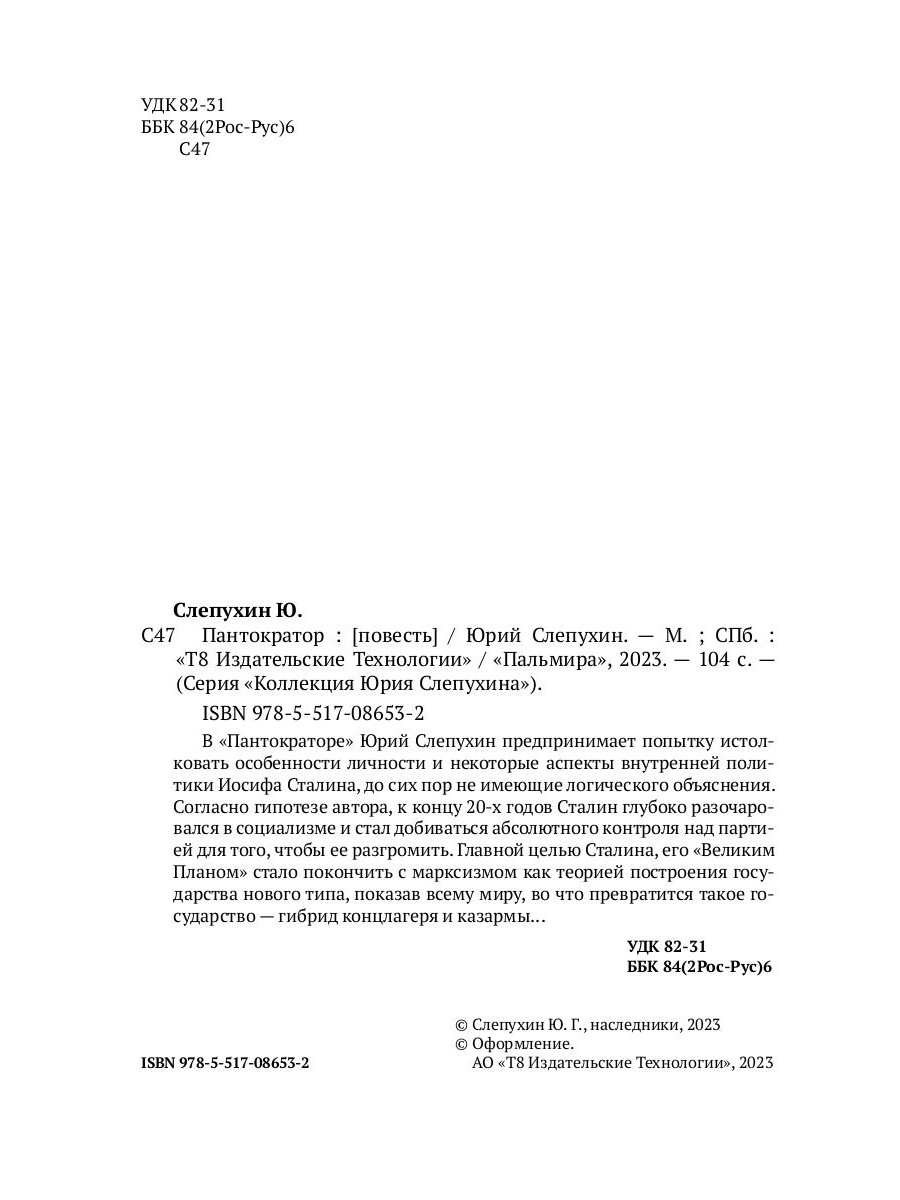 Юрий Слепухин - (1926-1998) - писатель, автор романов и публицистических статей, до конца 1950-х годов живший в послевоенной Европе и Аргентине. В своем творчестве он следовал гуманистическим традициям классической русской литературы. Большое значение в его произведениях занимают темы любви, милосердия и отношений государства и личности в разные исторические эпохи. Ю. Слепухин - не политолог, не профессиональный историк. Он - одухотворенный художник, литератор. Поэтому для него главное - трагедия утраты человеческой сущности, олицетворенная в "пантократорстве".