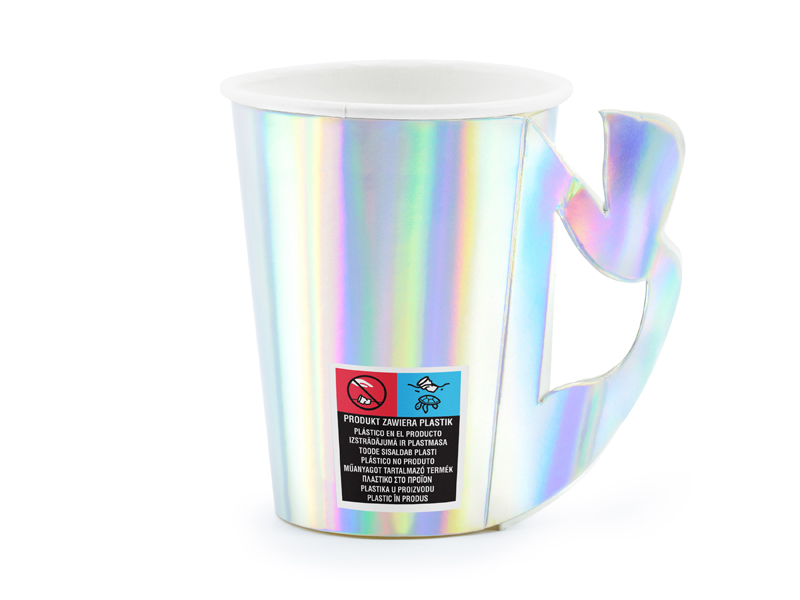 Cups Marmaid made of iridescent paper with tail shaped ear, hold up to 220ml (7.44 oz). Beverage cups bear the printed marking required by Commission Implementing Regulation (EU) 2020/2151 of 17 December 2020 laying down rules on harmonised marking specifications on single-use plastic products listed in Part D of the Annex to Directive (EU) 2019/904 of the European Parliament and of the Council on the reduction of the impact of certain plastic products on the environment. The product is labelled only in Polish, Spanish, Latvian, Estonian, Portuguese, Hungarian, Greek, Croatian and Romanian.