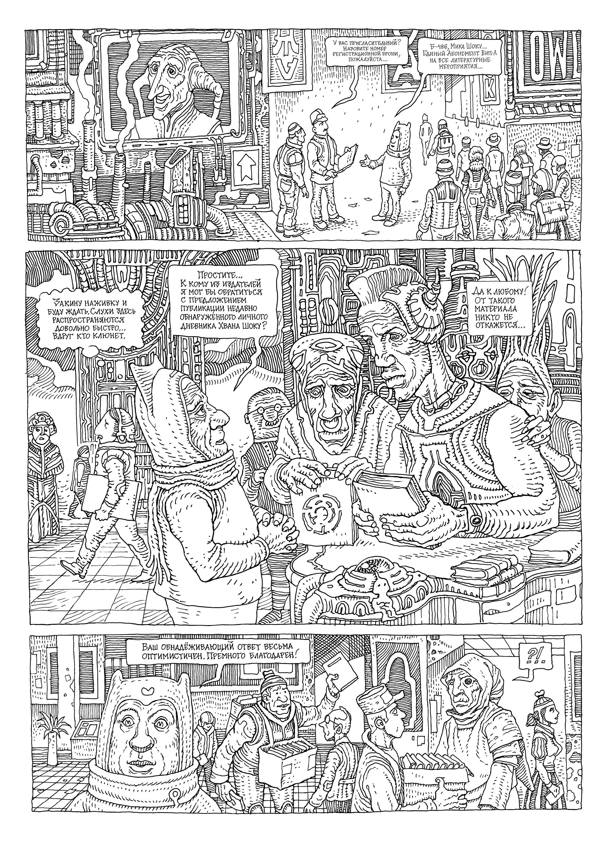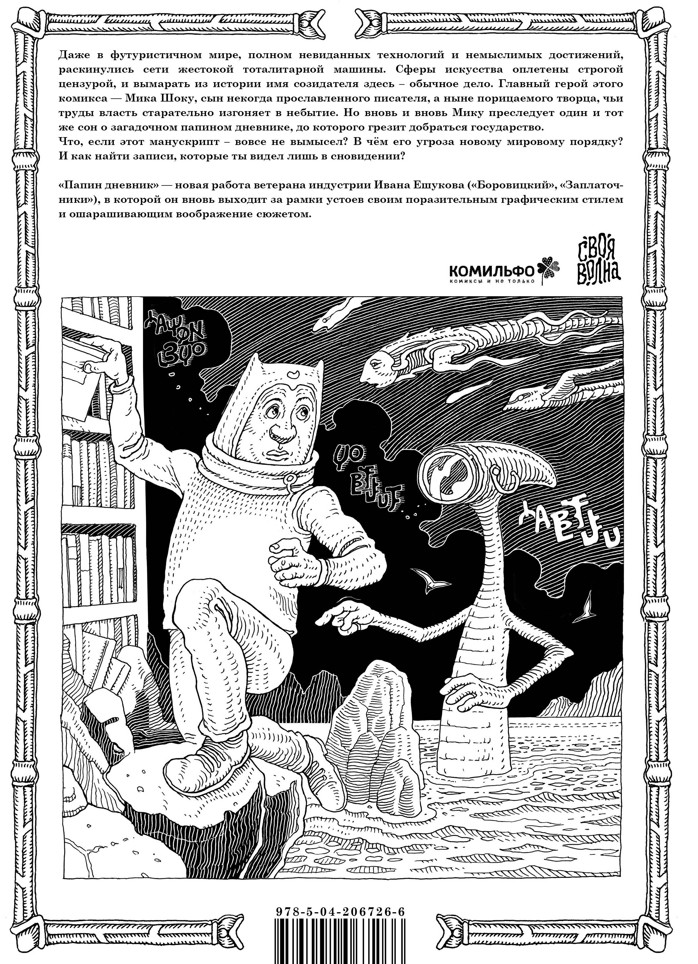 Даже в футуристичном мире, полном невиданных технологий и немыслимых достижений, раскинулись сети жестокой тоталитарной машины. Сферы искусства оплетены строгой цензурой, и вымарать из истории имя созидателя здесь - обычное дело. Главный герой этого комикса - Мика Шоку, сын некогда прославленного писателя, а ныне порицаемого творца, чьи труды власть старательно изгоняет в небытие. Но вновь и вновь Мику преследует один и тот же сон о загадочном папином дневнике, до которого грезит добраться государство. Что, если этот манускрипт - вовсе не вымысел? В чём его угроза новому мировому порядку? И как найти записи, которые ты видел лишь в сновидении? «Папин дневник» - новая работа ветерана индустрии Ивана Ешукова («Боровицкий», «Заплаточники»), в которой он вновь выходит за рамки устоев своим поразительным графическим стилем и ошарашивающим воображение сюжетом.| Издательство | ООО "Издательство "Эксмо" |