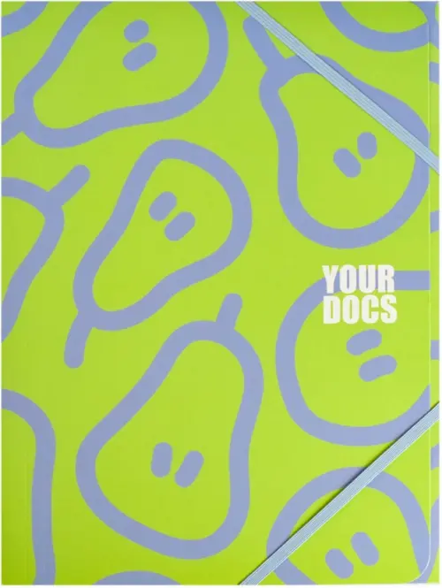 Папка для документов картонная арт. 66544/ 50 ГРУШИ (формат А4+ (238х320 мм); одно отделение (-я), застёжки-резинки на углах; материал: мелованный картон 300 г/м?, декор: полноцветная печать, глянцевая ламинация, красочность форзаца: печать пантоном; особенности: биговки на корешке и клапанах; индивидуальная упаковка: ПЭТ-пакет)