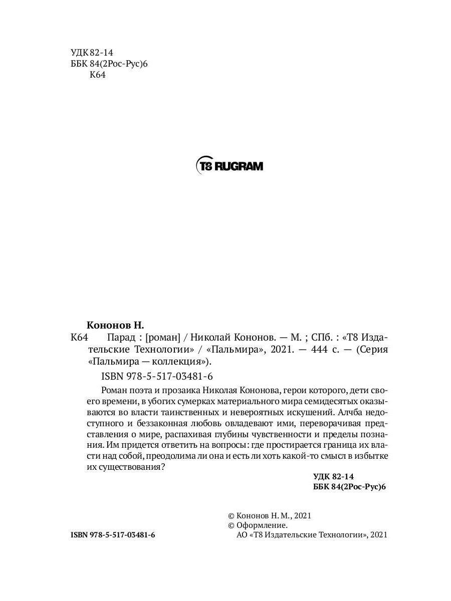 Роман поэта и прозаика Николая Кононова, герои которого, дети своего времени, в убогих сумерках материального мира семидесятых оказываются во власти таинственных и невероятных искушений. Алчба недоступного и беззаконная любовь овладевают ими, переворачивая представления о мире, распахивая глубины чувственности и пределы познания. Им придется ответить на вопросы: где простирается граница их власти над собой, преодолима ли она и есть ли хоть какой-то смысл в избытке их существования?