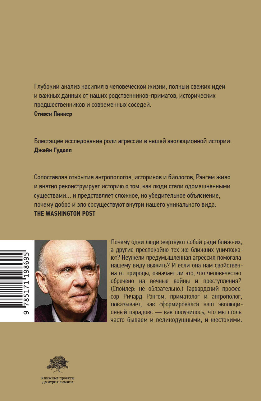 Гоббс говорил, что человек по природе своей жесток, и поэтому общество должно держать его под контролем. Руссо, напротив, считал, что человек по природе миролюбив и спокоен, и это влияние общества подталкивает его к насилию. Питер Рэнгем согласен и с той, и с другой позицией. Чтобы доказать свою теорию с эволюционной точки зрения, Рэнгем посвящает большую часть книги объяснению процесса одомашнивания животных. Этот процесс затрагивает как поведенческие, так и физиологические характеристики вида: тело и мозг уменьшаются, морда не так выдается вперед по отношению ко лбу, поведения вида в целом становится менее агрессивным. Оказывается, все эти изменения произошли и с человеком. Homo sapiens способен на чудеса кооперации и толерантности. Тогда как объяснить, что человек при всей своей покладистости все еще способен на немыслимые жестокости, на массовые уничтожения себе подобных? Для ответа на этот вопрос Рэнгем разделяет агрессию на два типа: реактивную и проактивную. Объясняя, в чем их различия, автор убедительно показывает, каким образом в человеке развились две, казалось бы, противоположные черты: добродетель и преднамеренная жестокость.| Издательство | АСТ |