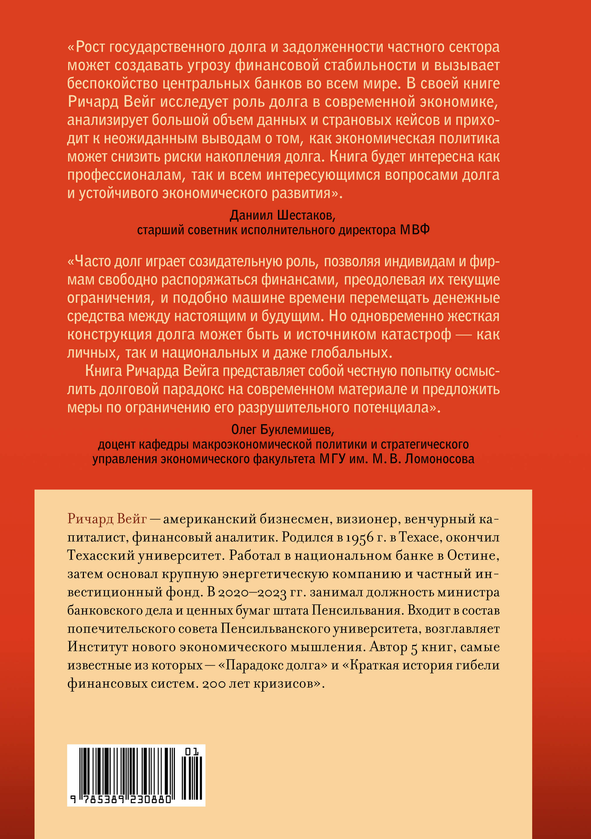 В своей иконоборческой книге Ричард Вейг исследует активы, пассивы и доходы США и еще шести ведущих экономик мира (Китая, Германии, Японии, Великобритании, Индии, Франции), их государственный и частный долг, чтобы выявить "чистую стоимость стран". Целостный анализ Вейга показывает, что реальным фактором, который движет как финансовыми кризисами, так и растущим неравенством, - а также, как ни парадоксально, экономическим ростом, - является постоянно растущий частный долг. Парадокс заключается в том, что, хотя долг имеет решающее значение для увеличения ВВП, он также приносит нестабильность, если не проводить периодическое сокращение доли заемных средств - а это весьма непросто. Но долгом можно управлять, и в конце книги Вейг показывает, как это можно сделать в различных сферах экономики, от торговли и недвижимости до студенческих кредитов на образование.| Издательство | Азбука-Аттикус Издат.группа ООО |