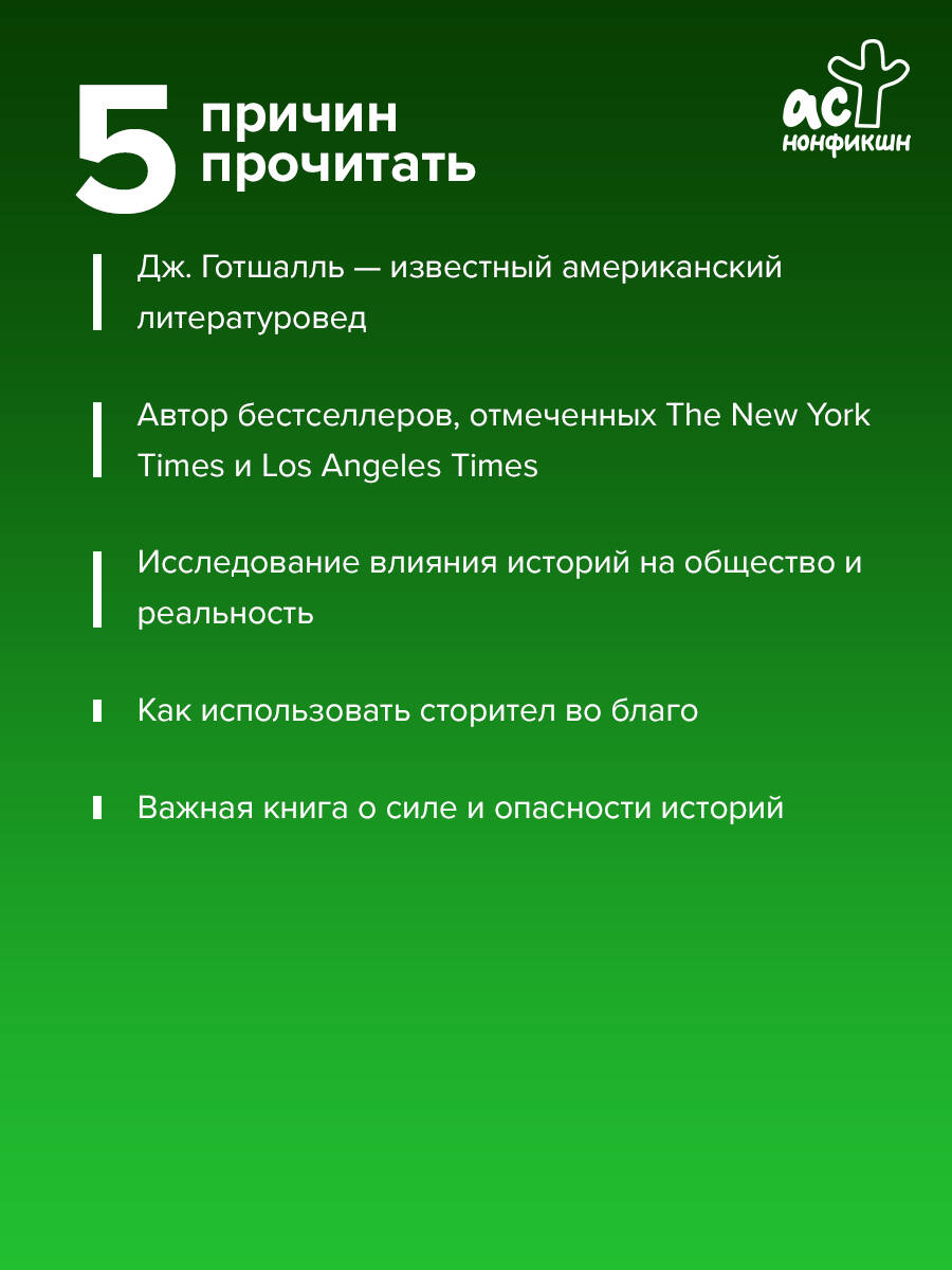 Истории - это мощнейший инструмент влияния, который люди используют повсеместно, от повседневного общения до глобальных маркетинговых и пропагандистских кампаний. Они формируют наше мировоззрение, вызывая сочувствие и понимание, но также могут сеять разногласия и ненависть. Эта книга исследует всеобъемлющую роль нарративов в нашей жизни, показывая, как мы ежедневно погружаемся в потоки историй и как эта "подталкивающая магия" повествования определяет наше взаимодействие с миром. Вероятно, вы настроены скептически - так и должно быть. В конце концов, я утверждал, что я ученый, но до сих пор единственное, что я сделал - это рассказал вам историю. И если вы вынесете из этой книги только один урок, то он должен быть таким: НИКОГДА. НЕ ДОВЕРЯЙ. РАССКАЗЧИКУ. Джонатан Готшалль (родился 20 сентября 1972 года) - американский литературовед, специализирующийся на литературе и эволюции. Выдающийся научный сотрудник кафедры английского языка в колледже Вашингтона и Джефферсона в Пенсильвании.| Издательство | Издательство "АСТ" |