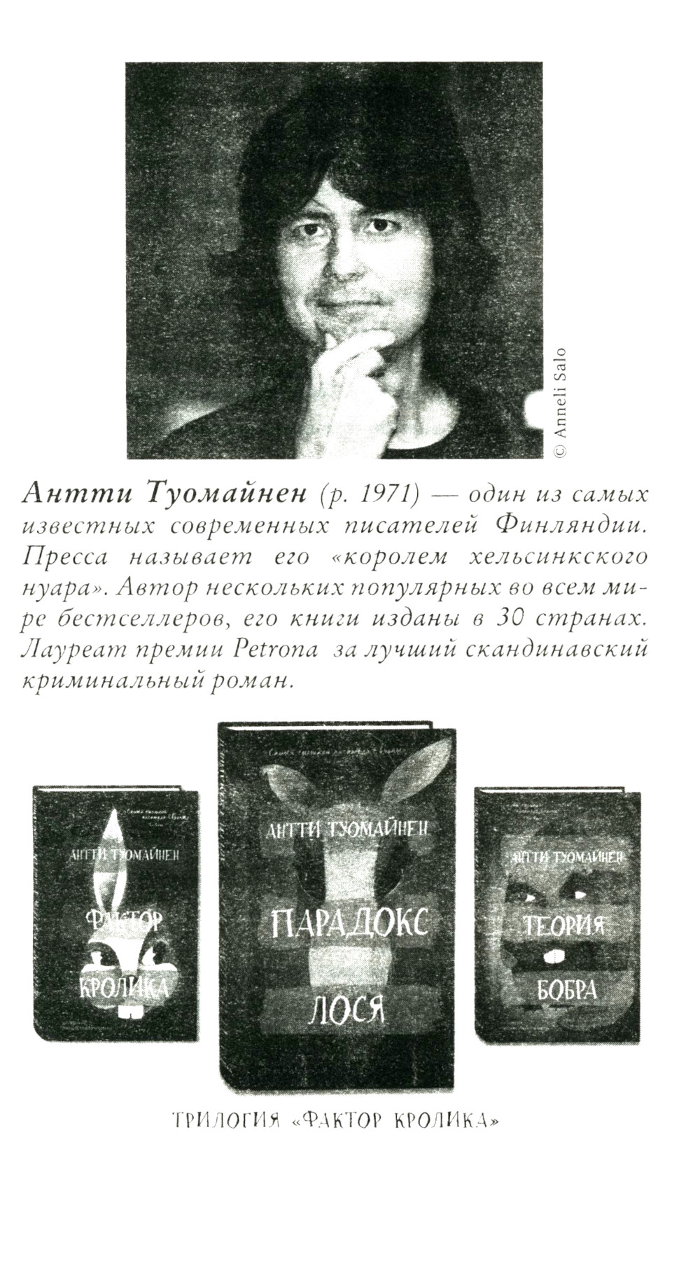 Во второй части комедийной трилогии «Фактор кролика» одного из самых популярных писателей Финляндии Антти Туомайнена бывший страховой математик Хенри, получивший в наследство парк приключений с огромными долгами представителям криминального мира, продолжает бороться за успех и независимость бизнеса и свое личное счастье. Способность производить сложнейшие расчеты пригодится ему сейчас как никогда ранее в жизни.| Издательство | Синдбад |
