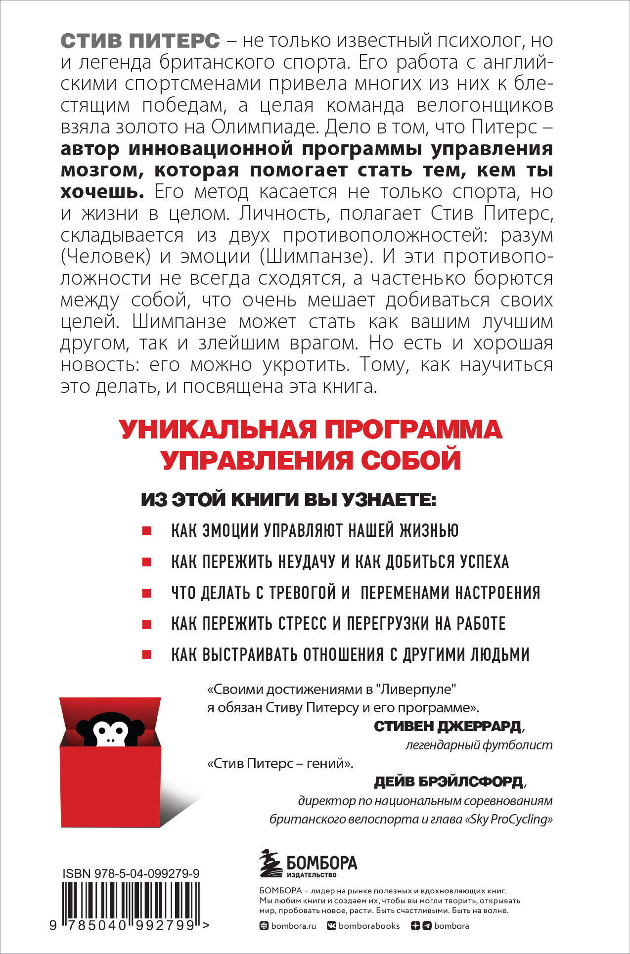 Рабочее место профессора Питерса находится не в тихом закрытом кабинете, а на тренировочной базе различных спортивных клубов. В качестве психолога он сотрудничает со многими известными спортсменами, которые признаются, что обязаны своими победами беседам с этим выдающимся специалистом. Стив Питерс - автор новаторской методики управления мозгом, которая помогает привести психологическое состояние человека в идеальную форму и сформировать готовность к высокому результату. В мозге, считает Питерс, доминируют две противоположности, которые можно представить в виде яркой метафоры: Человек (разум) и Шимпанзе (эмоции). Для того, чтобы добиться своих целей, нужно научиться укрощать своего Шимпанзе. О том, как это сделать, и написана книга.
