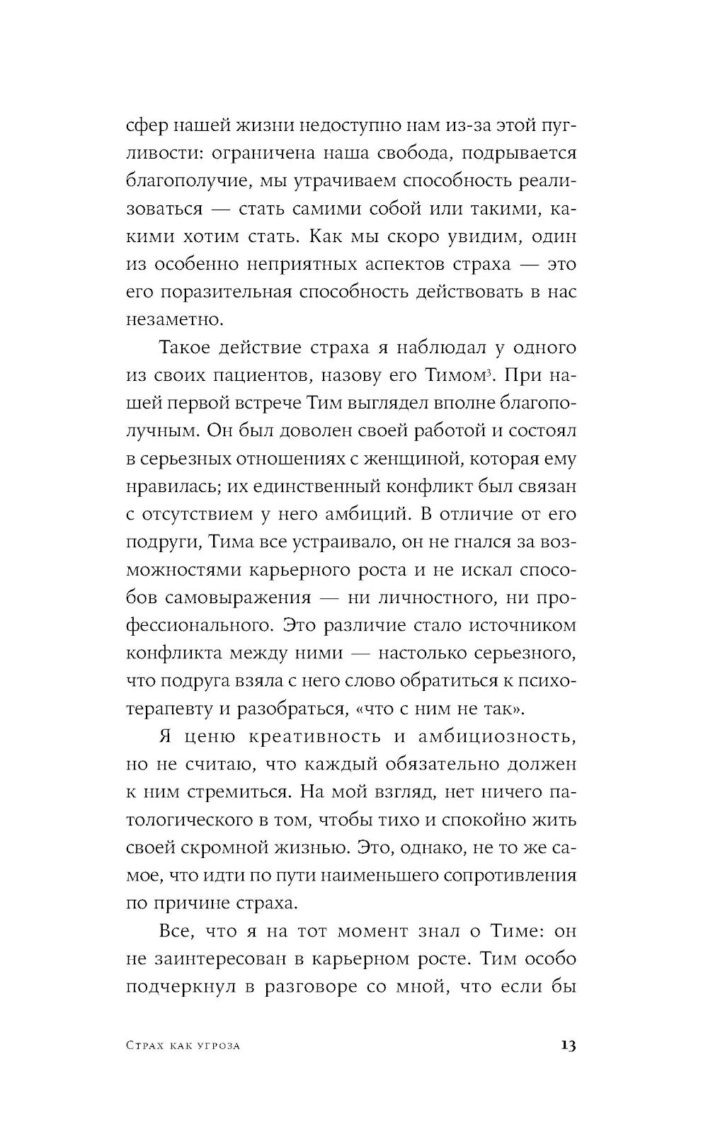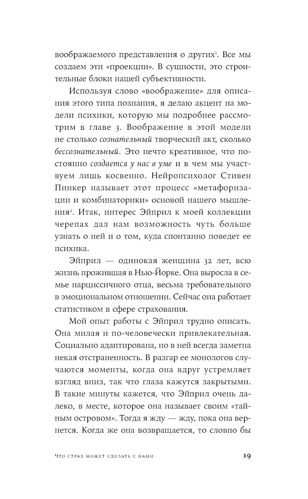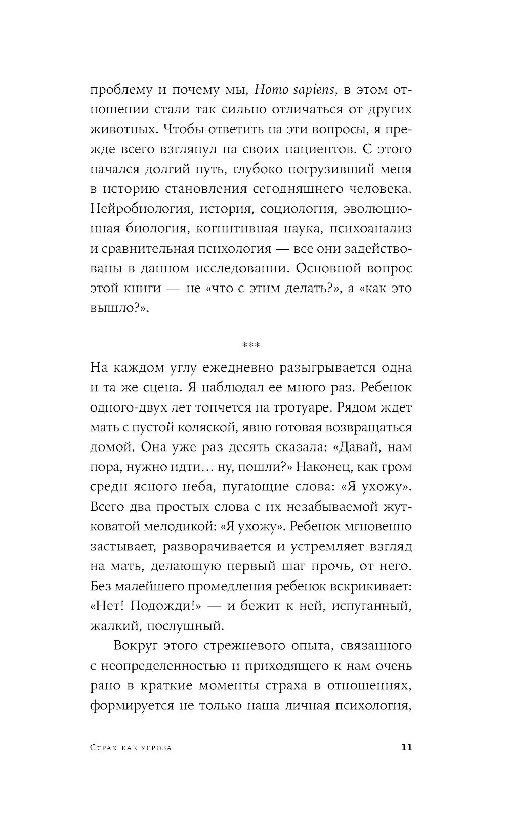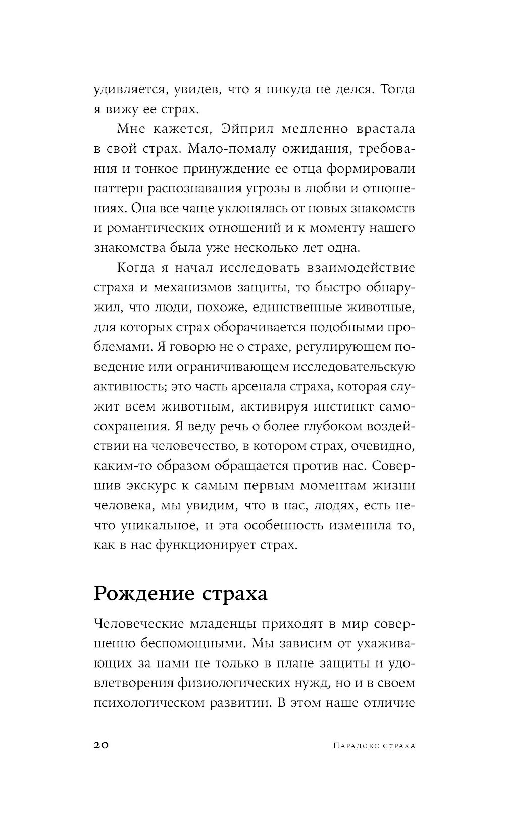 Миллионы лет назад страх помог человеческому виду выжить, а сегодня он парализует нас в опасных ситуациях, заставляет сомневаться в собственных возможностях и вызывает повышенную тревожность. Почему страх до сих пор присутствует в повседневной жизни людей, мешая нам меняться и двигаться вперед? Каждый биологический вид выработал собственные способы распознавания и избегания опасности. Например, крысы с рождения боятся запаха кошек - эта эволюционная особенность помогает им уходить дальше от хищников. Но страх человека приобрёл необычные формы и масштабы. Часто он работает не как помощник в выживании, а становится тем, от чего мы пытаемся избавиться. Человеческие младенцы приходят в мир куда более беспомощными, чем любые другие животные. В детстве мы зависим от родителей не только в удовлетворении базовых нужд, но и в психологическом плане. Уязвимое состояние, в котором мы пребываем в годы формирования личности, повышает риски возникновения ряда психологических проблем, в том числе повышенной тревожности. Эмоция страха может заставить нас сделать многое: сосредоточиться, стать неподвижными, стремглав бежать, бороться за жизнь или, напротив, несколько отстраниться от неё. От чего зависит, будет страх помогать или мешать нам? Существует ли полезный и вредный страх? Как понять, стоит ли прислушаться к нему? Какая связь между детскими играми и страхом? Как страх влияет на развитие воображения? Клинический психолог Фрэнк Фаранда провёл исследование, чтобы ответить на все интересующие вопросы о страхе. Автор опирается на открытия в нейробиологии, социологии, эволюционной биологии, а также исследует опыт своих клиентов, чтобы помочь нам разобраться в природе и причинах страха раз и навсегда.| Издательство | Альпина нон-фикшн |