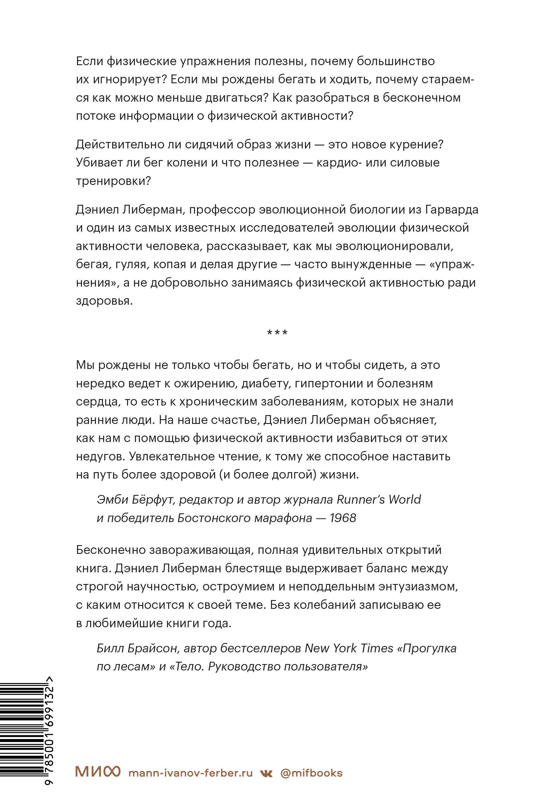 Профессор биологии Гарварда рассказывает, как люди эволюционировали, чтобы выполнять физические упражнения, избегая ненужных усилий и предлагает, как сделать спорт приятным и не стыдиться недостаточной активности.| Издательство | Манн, Иванов и Фербер |
