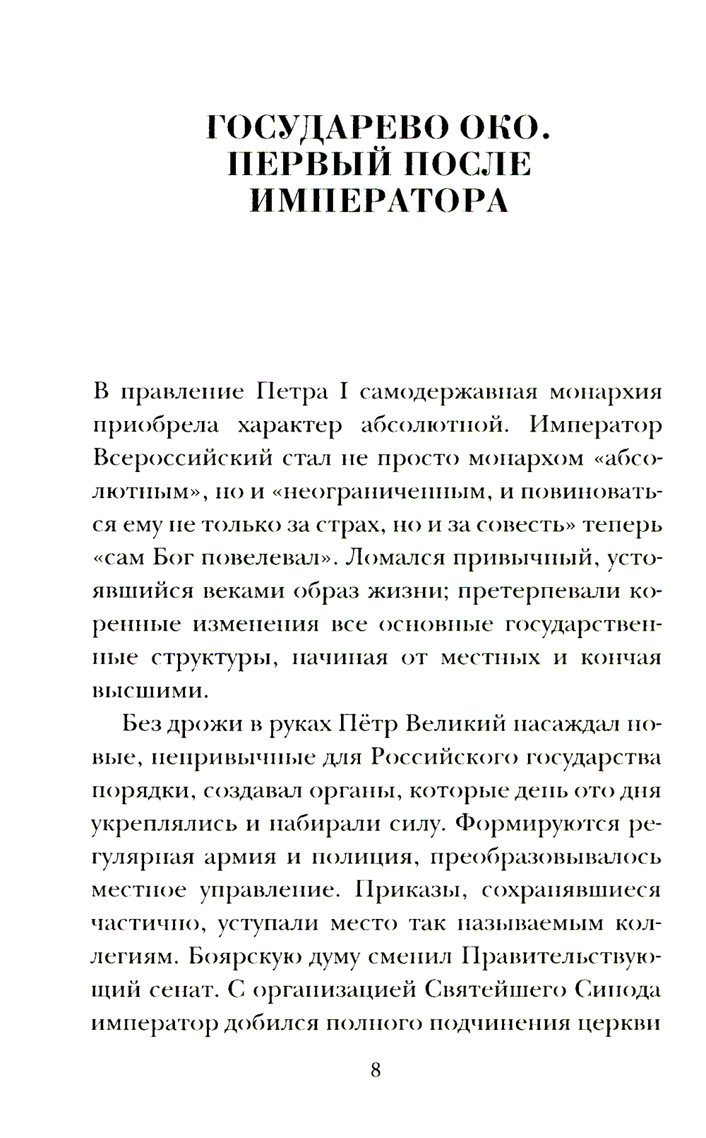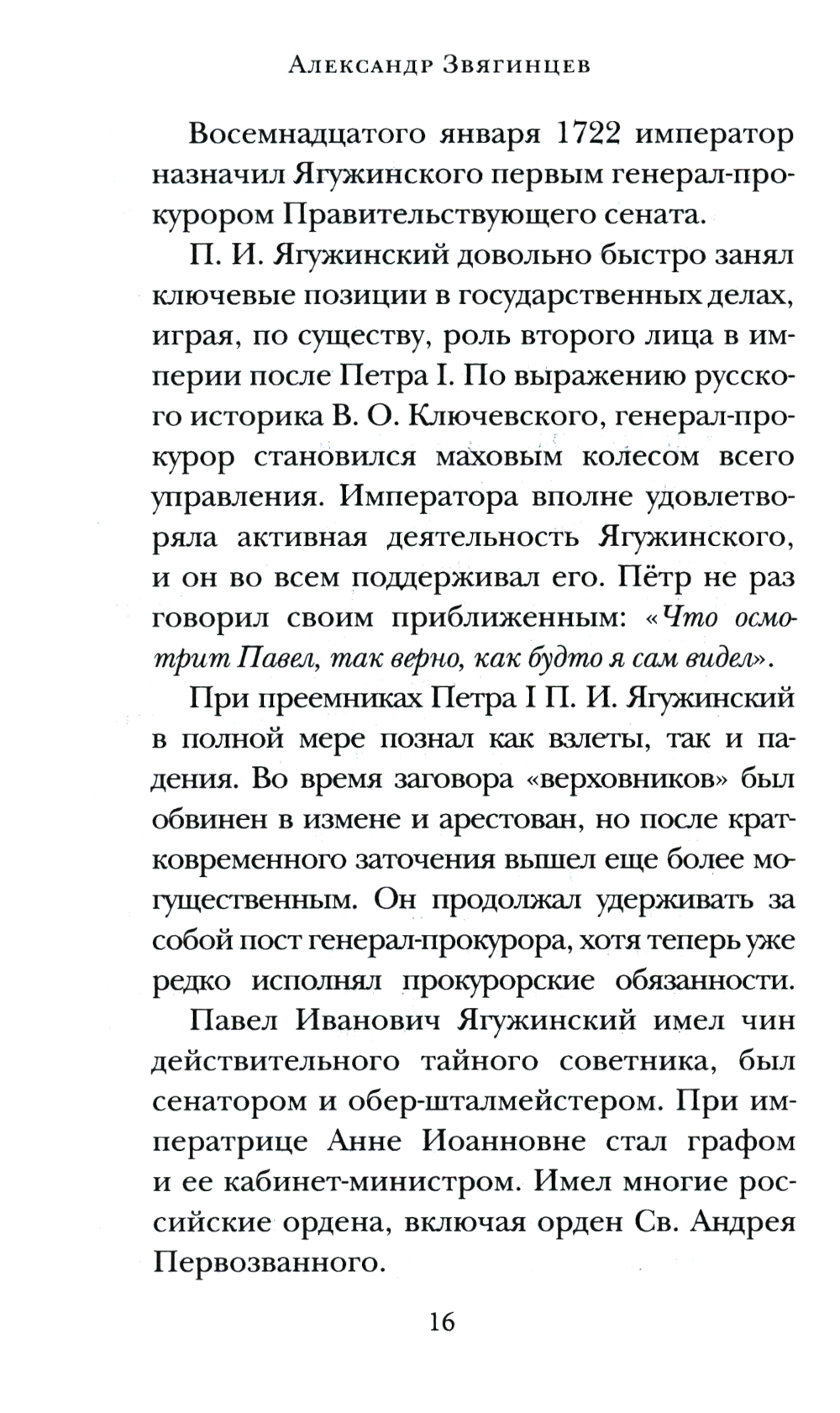 Очередной том исторических расследований Александра Звягинцева переносит нас во времена Российской Империи: читатель окажется свидетелем возникновения и становления отечественной системы власти и управления при Петре Первом, деятельности Павла Ягужинского и Гавриила Державина и кризиса монархии во времена Петра Столыпина и Ивана Щегловитова, чьи слова о «неохотной борьбе паралитиков власти с эпилептиками революции» оказались для своей эпохи ключевым, но проигнорированным предостережением. Как и во всех книгах серии, материал отличается максимальной полнотой и объективностью, а портреты исторических личностей, будь то представители власти или оппозиционеры (такие как Иван Каляев и Вера Засулич), представлены во всей их сложности и противоречивости…| Издательство | Рипол Классик |