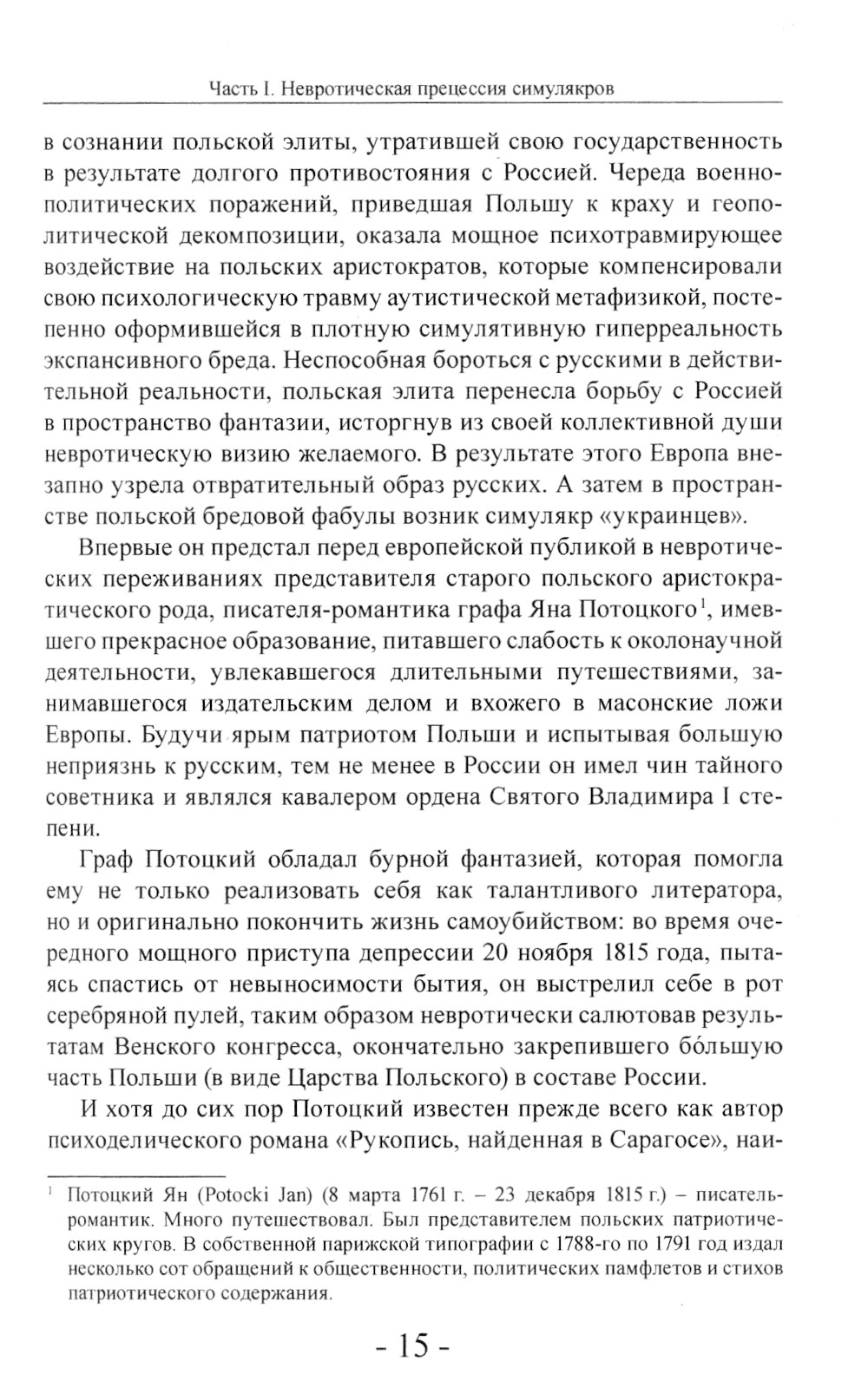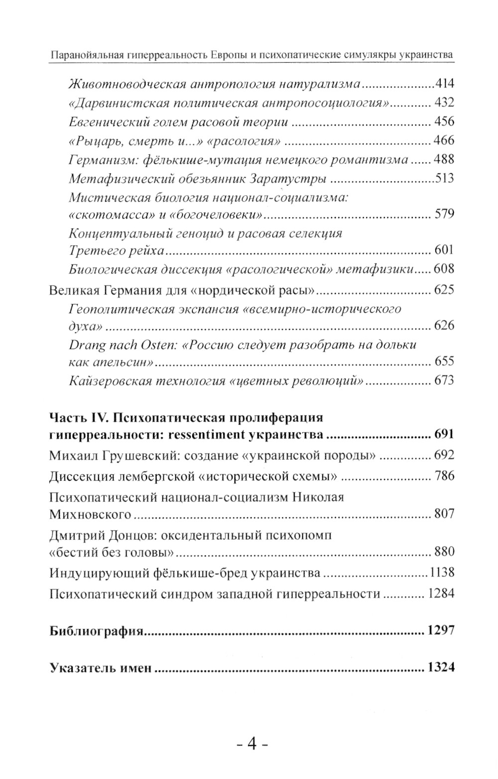 Эта книга о фундаментальной значимости идей, о том, как субъективные смыслы формируют человеческое сознание и определяют объективную реальность. Рассматривая онтологию западного мировосприятия, автор данного исследования скрупулёзно описывает уход европейского сознания из сферы объективного в тотальность субъективности, чьи идейные манифестации нередко рождаются в психическом сумраке паранойяльного бреда, обретая вычурные формы философских концепций и социально-политических доктрин, из которых произрастает система психопатических симулякров Европы. Анализируя значительный объём фактологического материала, автор предлагает взглянуть на проект «Ukraina» как на попытку локальной объективации одной из бредовых фабул европейской паранойяльной гиперреальности.| Издательство | Книжный мир |