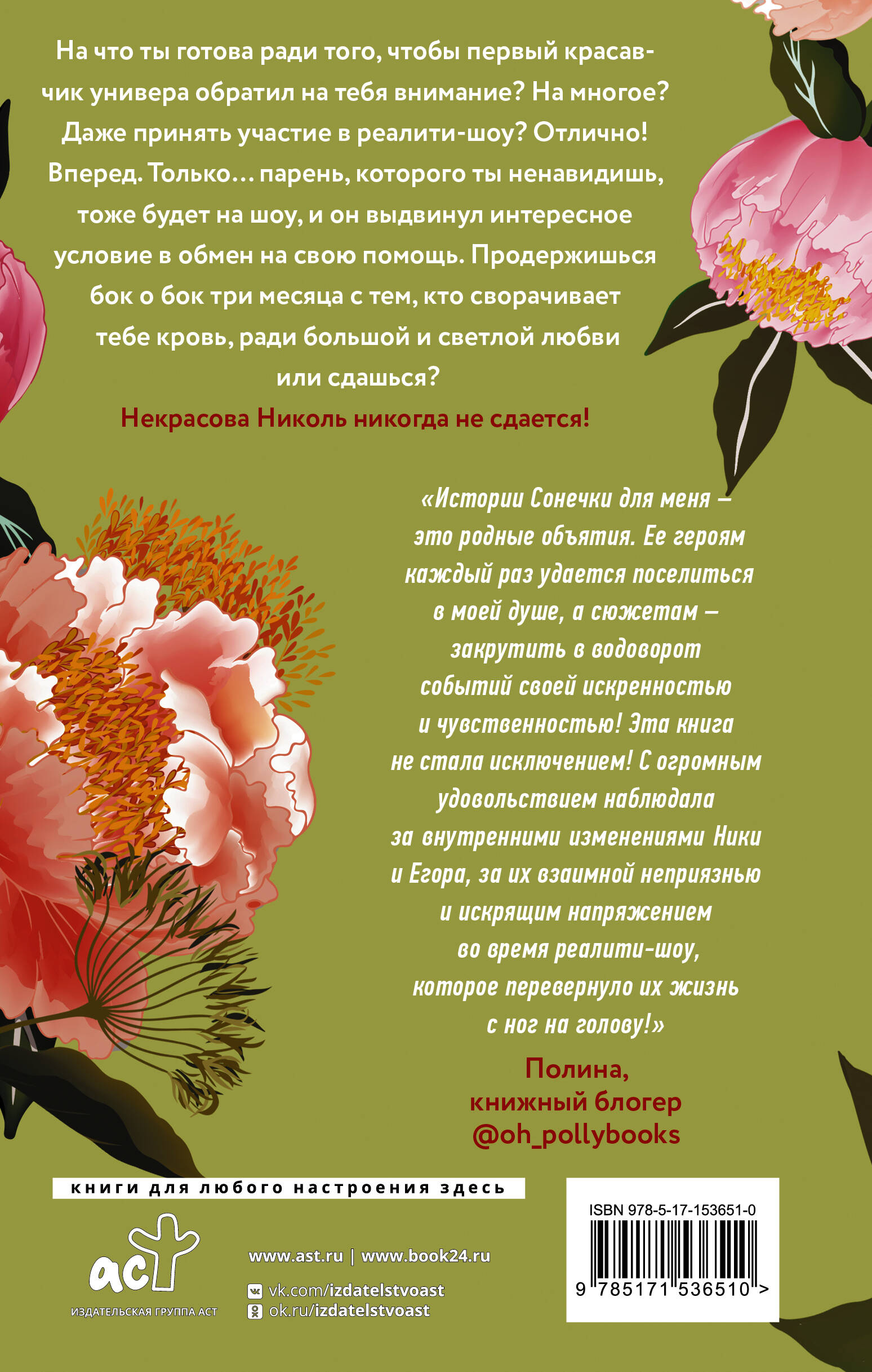 На что ты готова ради того, чтобы первый красавчик универа обратил на тебя внимание? На многое? Даже принять участие в реалити-шоу? Отлично! Вперед. Только… парень, которого ты ненавидишь, тоже будет на шоу, и он выдвинул интересное условие в обмен на свою помощь. Продержишься бок о бок три месяца с тем, кто сворачивает тебе кровь, ради большой и светлой любви, или сдашься? Некрасова Николь никогда не сдается!| Издательство | ИЗДАТЕЛЬСТВО "АСТ" |