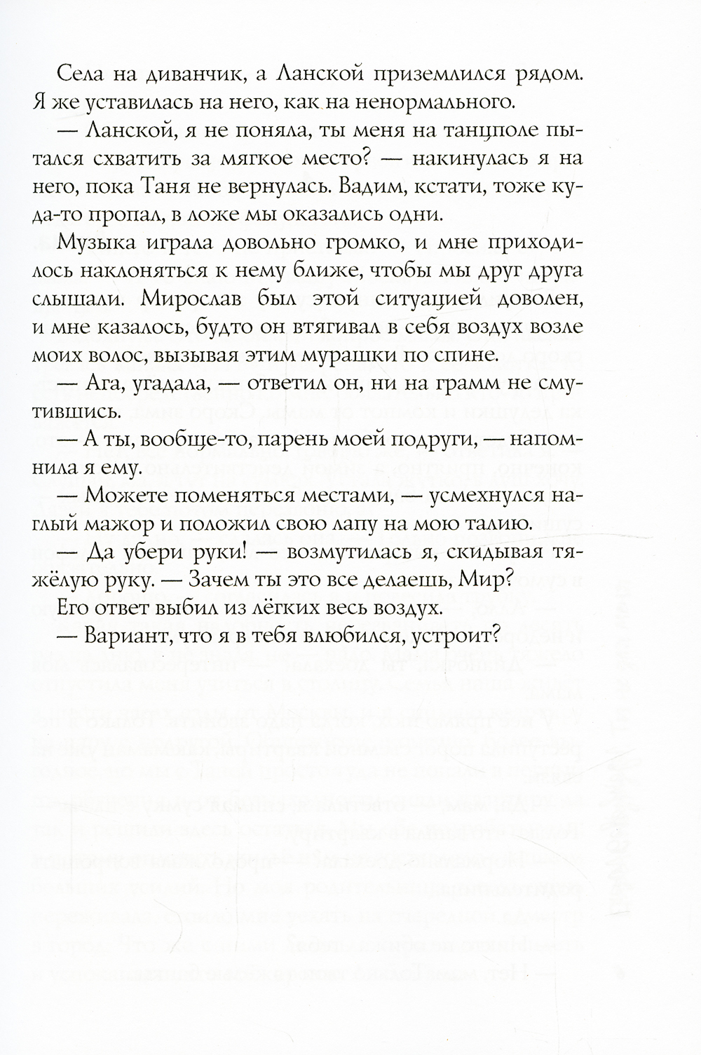 - Ланской, я не поняла, ты меня на танцполе пытался лапать? - накинулась я на него, пока Таня не вернулась. Музыка играла довольно громко, и мне приходилось наклоняться к нему ближе, чтобы мы друг друга слышали. Мирослав был этой ситуацией доволен, и мне казалось, будто он втягивал в себя воздух возле моих волос, вызывая этим мурашки по спине. - Ага, угадала, - ответил он, ни на грамм не смутившись. - А ты, вообще-то, парень моей подруги, - напомнила я ему... - Можем поменять вас местами, - усмехнулся он и положил свою лапу на мою талию. - Да убери руки! - возмутилась я, скидывая тяжёлую руку. - Зачем ты это все делаешь, Мир? Его ответ выбил из лёгких весь воздух. - Вариант, что я в тебя влюбился, устроит? Моя жизнь была спокойной и размеренной, пока в неё не ворвался он - парень моей подруги.| Издательство | Т8 RUGRAM |