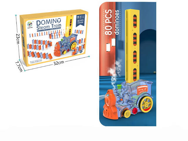 Паровозик, оснащенный необычным механизмом, который самостоятельно выстраивает домино на нужном расстоянии - увлекательная интерактивная игрушка для детей от 3х лет. Паровоз со световыми и звуковыми эффектами пускает настоящий пар из трубы. Он поможет ребенку развить воображение, координацию, цветовое восприятие, тактильные ощущения и мелкую моторику рук, а также понимание принципов движения. До начала игры косточки домино следует загрузить в специальный отсек, который размещается на крыше игрушки. Набор содержит 80 домино. Батарейки ААА 3 штуки в комплект не входят. Упаковка: коробка. Размер одной доминошки 3,3*1,8 см