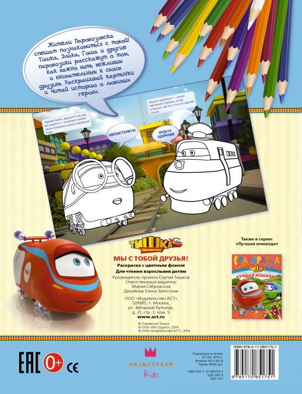 Жители Паровозовска спешат познакомиться с тобой! Тишка, Элька, Гоша и другие паровозики расскажут о том, как важно быть вежливым и внимательным к своим друзьям. Раскрашивай картинки и читай историю о любимых героях.| Серия | Тишка паровозик. Раскраска с цветным фоном |