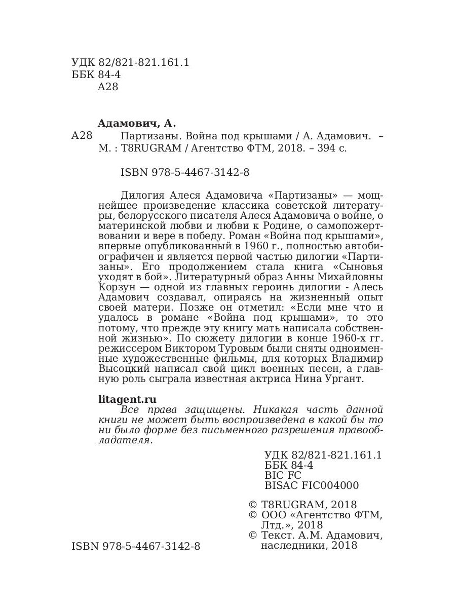 Дилогия Алеся Адамовича «Партизаны» - мощнейшее произведение классика советской литературы, белорусского писателя Алеся Адамовича о войне, о материнской любви и любви к Родине, о самопожертвовании и вере в победу. Роман «Война под крышами», впервые опубликованный в 1960 г., полностью автобиографичен и является первой частью дилогии «Партизаны». Его продолжением стала книга «Сыновья уходят в бой». Литературный образ Анны Михайловны Корзун - одной из главных героинь дилогии - Алесь Адамович создавал, опираясь на жизненный опыт своей матери. Позже он отметил: «Если мне что и удалось в романе «Война под крышами», то это потому, что прежде эту книгу мать написала собственной жизнью». По сюжету дилогии в конце 1960-х гг. режиссером Виктором Туровым были сняты одноименные художественные фильмы, для которых Владимир Высоцкий написал свой цикл военных песен, а главную роль сыграла известная актриса Нина Ургант.| Издательство | Т8 RUGRAM |