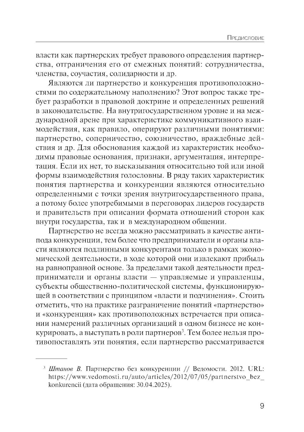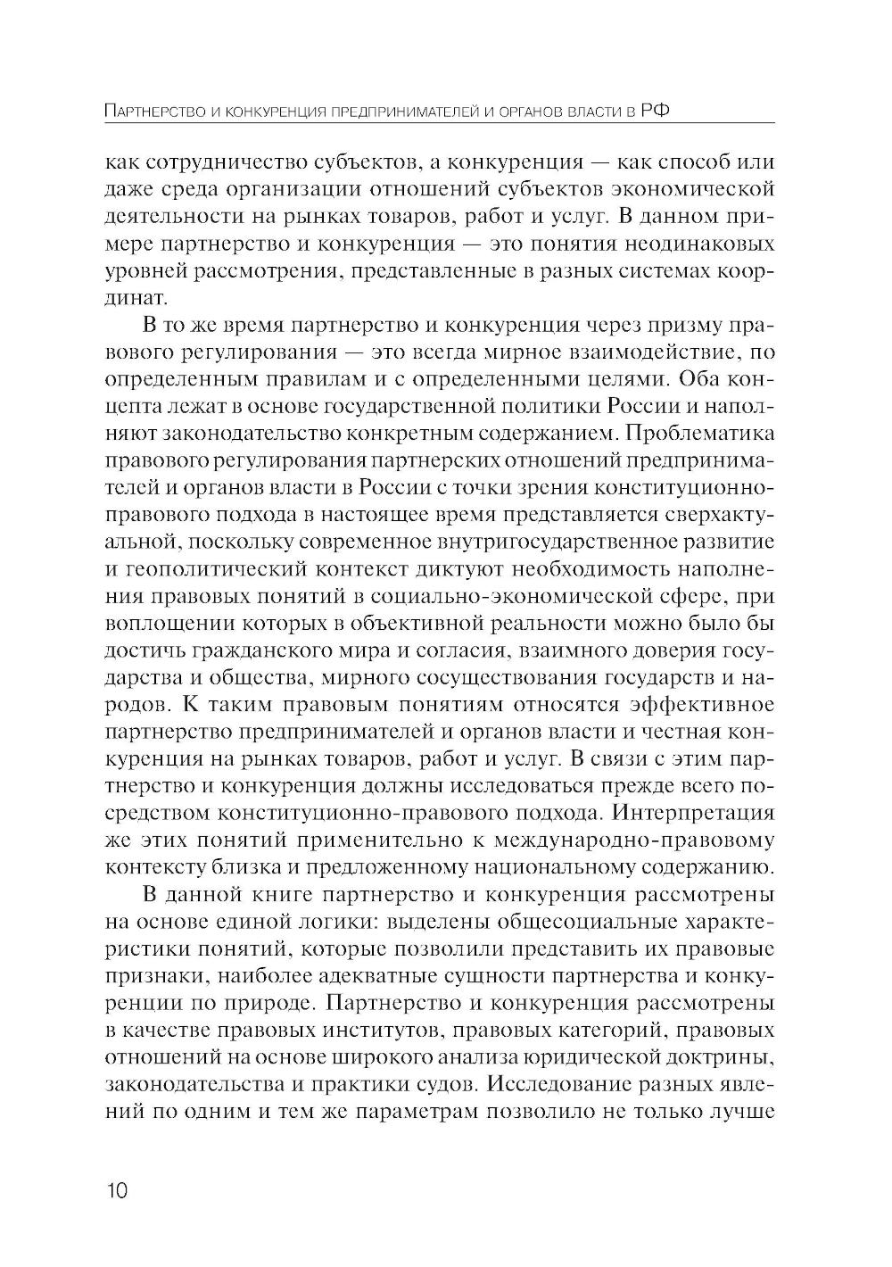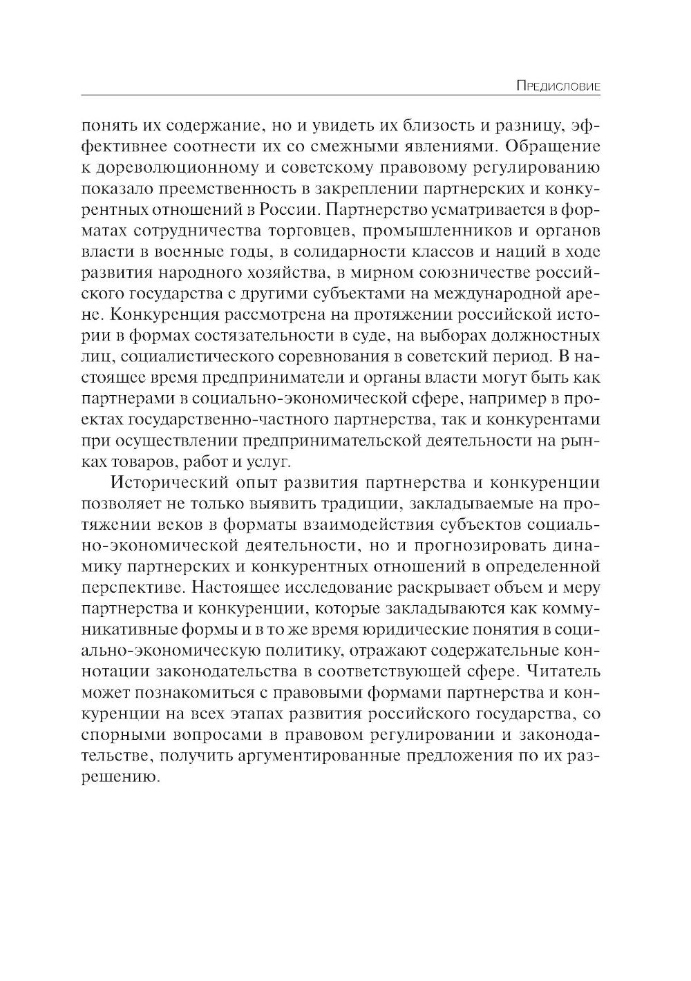 Монография посвящена вопросам правового регулирования таких общесоциальных и междисциплинарных явлений, как партнерство и конкуренция, неизбежно присутствующих в отношениях предпринимателей и органов власти. Изучены истоки возникновения партнерства и конкуренции в Российской Федерации с точки зрения правового подхода. Партнерство и конкуренция описаны по единой методике: рассмотрены их правовые признаки и правовое содержание в соотношении со смежными понятиями, определены конституционно-правовые основы партнерских и конкурентных отношений, выделены проблемы взаимодействия партнеров и конкурентов, возникающие в правоприменительной практике, а также предложены варианты совершенствования действующего законодательства. Даны ответы на вопросы, как наполняются правовые статусы субъектов в зависимости от того, занимают ли они позиции партнеров или конкурентов. Книга будет полезна широкому кругу специалистов, занимающихся правом, экономикой, вопросами истории, политики и управления, а также предпринимателям, сотрудникам государственных и муниципальных органов, ученым и преподавателям, студентам и всем тем, кому небезразлично развитие правового регулирования партнерства и конкуренции в Российской Федерации.| Издательство | ИД Высшей школы экономики |