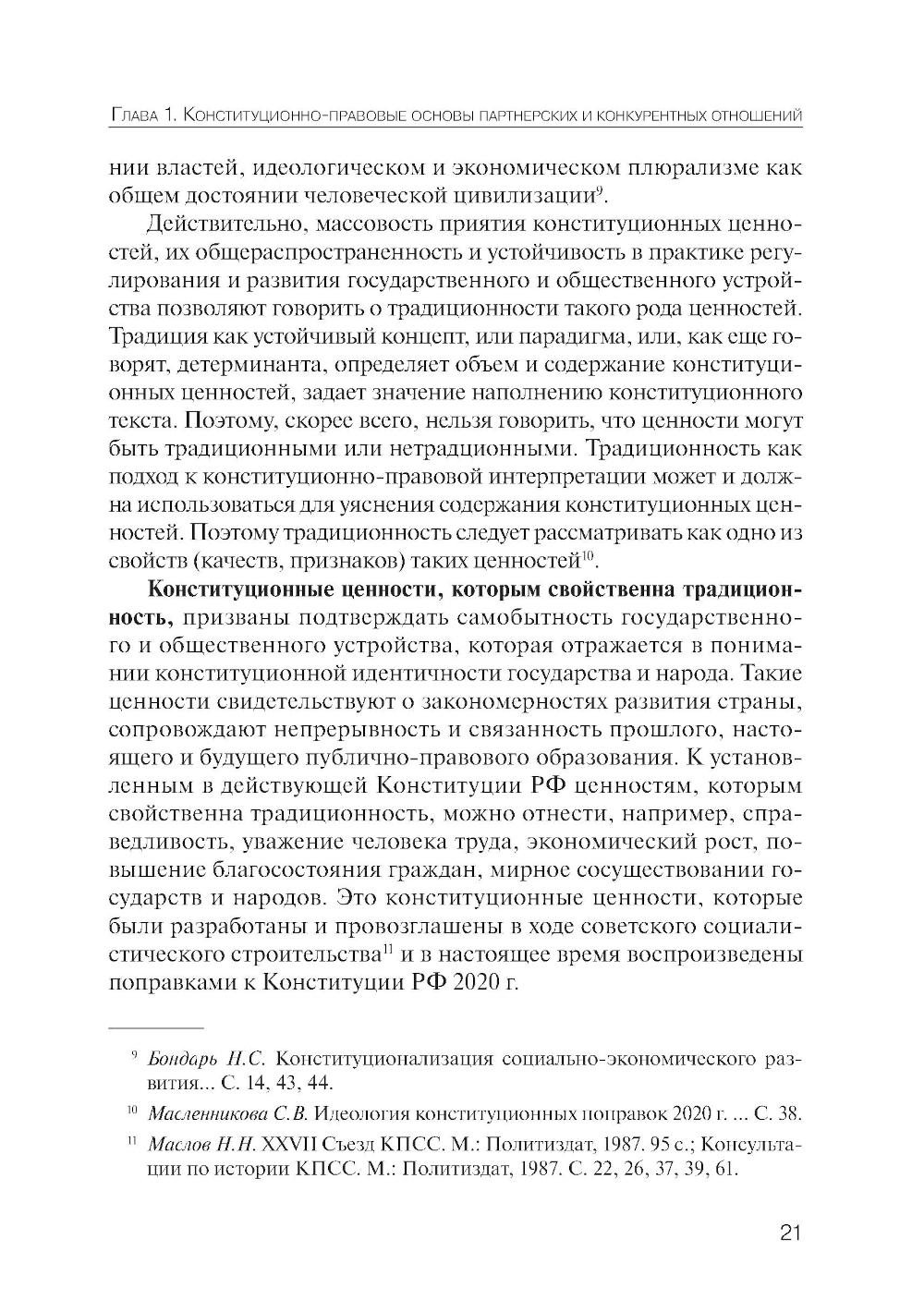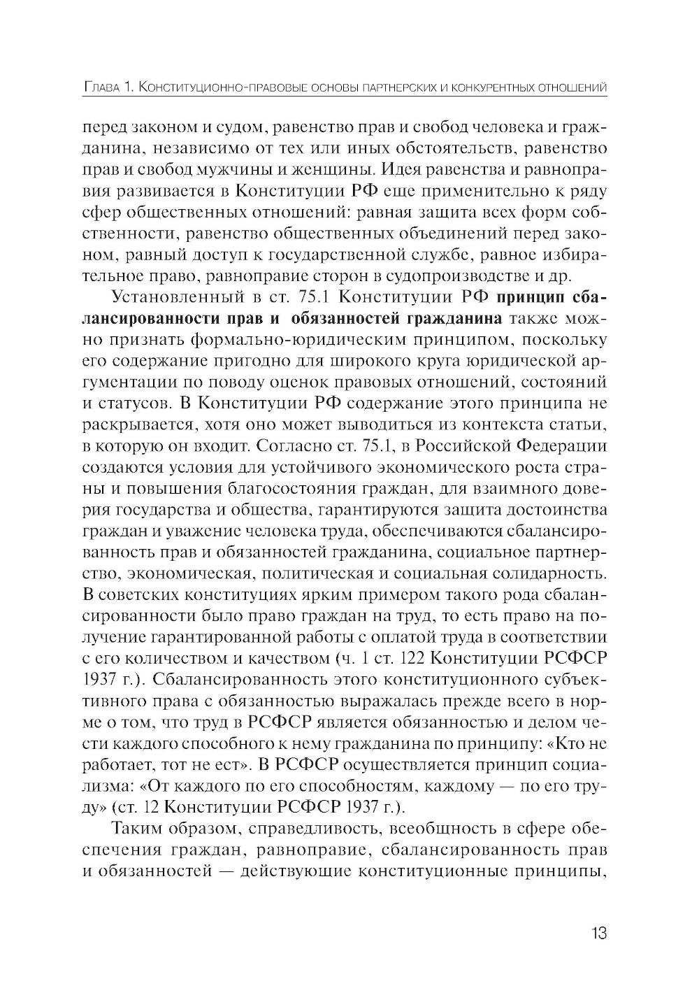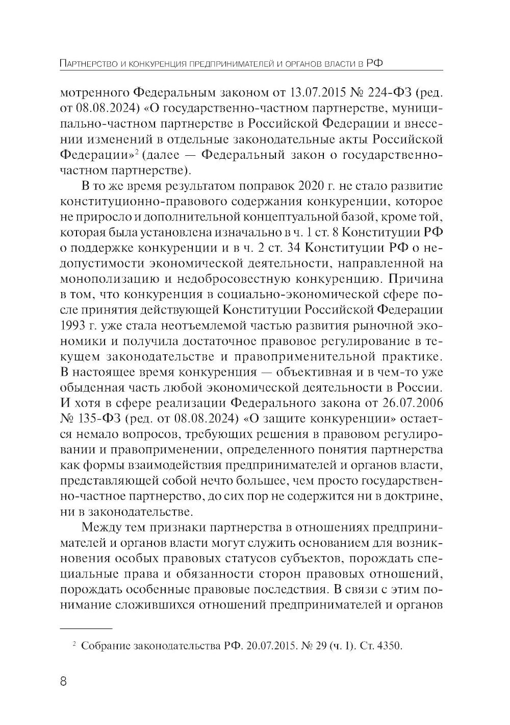 Монография посвящена вопросам правового регулирования таких общесоциальных и междисциплинарных явлений, как партнерство и конкуренция, неизбежно присутствующих в отношениях предпринимателей и органов власти. Изучены истоки возникновения партнерства и конкуренции в Российской Федерации с точки зрения правового подхода. Партнерство и конкуренция описаны по единой методике: рассмотрены их правовые признаки и правовое содержание в соотношении со смежными понятиями, определены конституционно-правовые основы партнерских и конкурентных отношений, выделены проблемы взаимодействия партнеров и конкурентов, возникающие в правоприменительной практике, а также предложены варианты совершенствования действующего законодательства. Даны ответы на вопросы, как наполняются правовые статусы субъектов в зависимости от того, занимают ли они позиции партнеров или конкурентов. Книга будет полезна широкому кругу специалистов, занимающихся правом, экономикой, вопросами истории, политики и управления, а также предпринимателям, сотрудникам государственных и муниципальных органов, ученым и преподавателям, студентам и всем тем, кому небезразлично развитие правового регулирования партнерства и конкуренции в Российской Федерации.| Издательство | ИД Высшей школы экономики |
