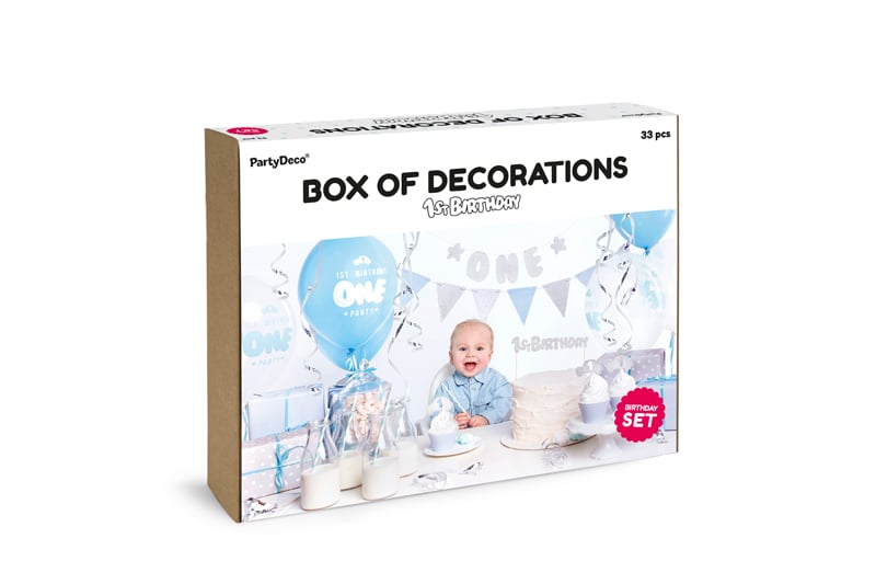 Party decorations set - 1st Birthday, silver, set contains: banner One (1 piece), paper garland (1 piece), cupcake toppers (6 pieces), blue muffin wrappers (6 pieces), cake topper (1 piece), straws (10 pieces), balloons (mix of designs, 6 pieces), silver streamers (1 piece) and sky-blue satin ribbon (width 6 mm, 1 piece).