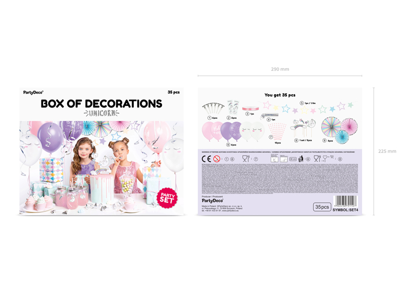 Party decorations set - Unicorn, set contains: paper garland (1 piece), cake topper (5 pieces), decorative rosettes (3 pieces), straws (10 pieces), silver whistles (6 pieces), stickers (2 pieces), balloons (mix of designs, 6 pieces), silver streamers (1 piece) and light pink satin ribbon (width 6 mm, 1 piece).