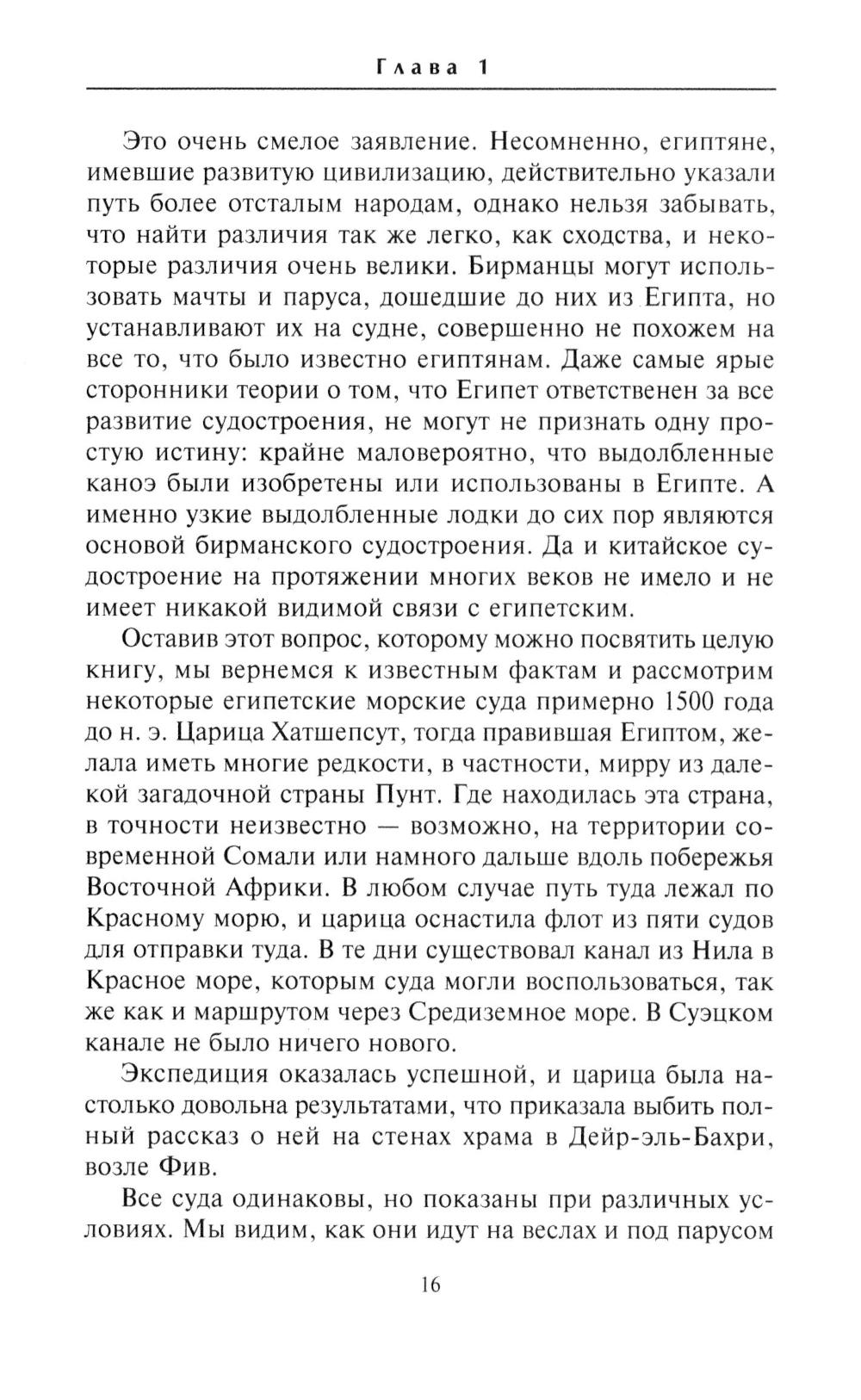 Предлагаемая читателю книга прослеживает историю развития парусного судна на протяжении шести тысячелетий - от древних времен до конца века. В ней рассматриваются суда Древнего Египта и Крита, Финикии, Греции и Рима, а также европейские, азиатские и американские суда. Следуя главным направлениям развития северных и южных европейских судов, авторы описывают технические и культурные факторы, определившие перемены в форме и назначении парусников - от древних судов с одинаковыми штевнями и единственной мачтой до больших и удивительно красивых пяти- и шестимачтовых кораблей века. Иллюстрации наглядно показывают детали конструкций судов и парусное оснащение разных периодов.| Издательство | Центрполиграф |