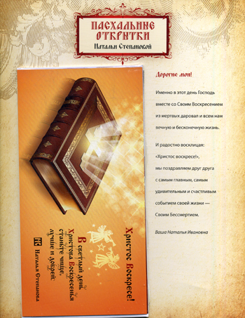 Впервые изданы красочные поздравительные пасхальные открытки Натальи Степановой, которые наверняка обрадуют родных и близких ее читателей. На обороте этих открыток приводится текст одного из заговоров, связанных с одним из самых великих церковных праздников. В наборе шесть красочных открыток и шесть конвертов на подложке с поздравлениями от Натальи Степановой.