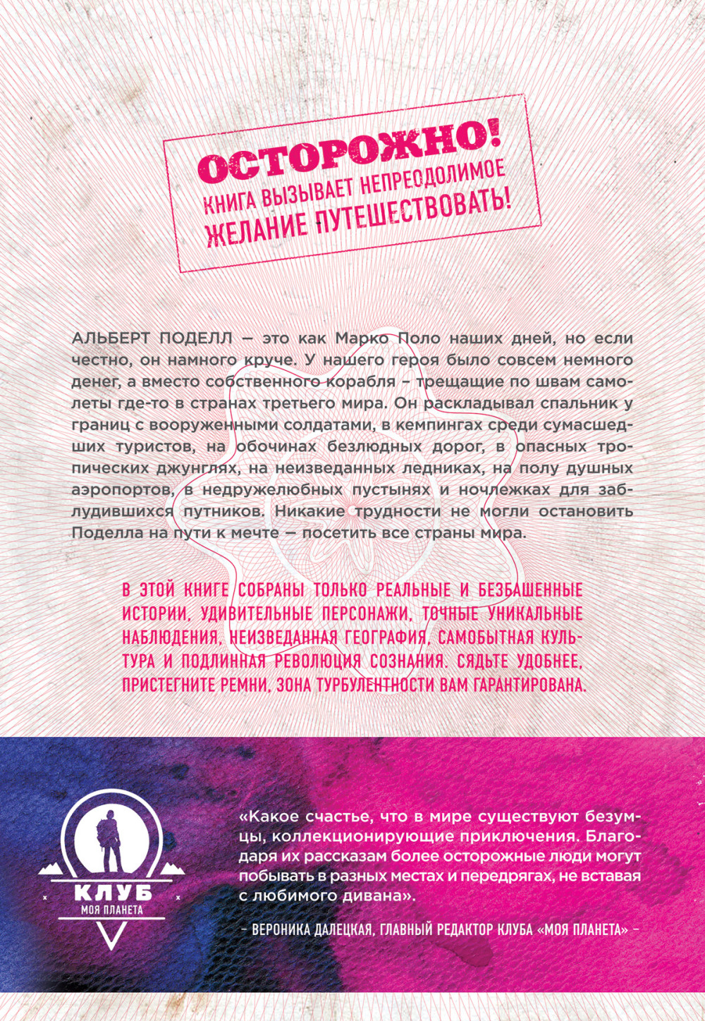 Альберт Поделл - это как Марко Поло наших дней, но если честно, он намного круче. У нашего героя было совсем немного денег, а вместо собственного корабля - трещащие по швам самолеты где-то в странах третьего мира. Он раскладывал спальник у границ с вооруженными солдатами, в кемпингах среди сумасшедших туристов, на обочинах безлюдных дорог, в опасных тропических джунглях, на неизведанных ледниках, на полу душных аэропортов, в недружелюбных пустынях и ночлежках для заблудившихся путников. Никакие трудности не могли остановить Поделла на пути к мечте - посетить все страны мира.