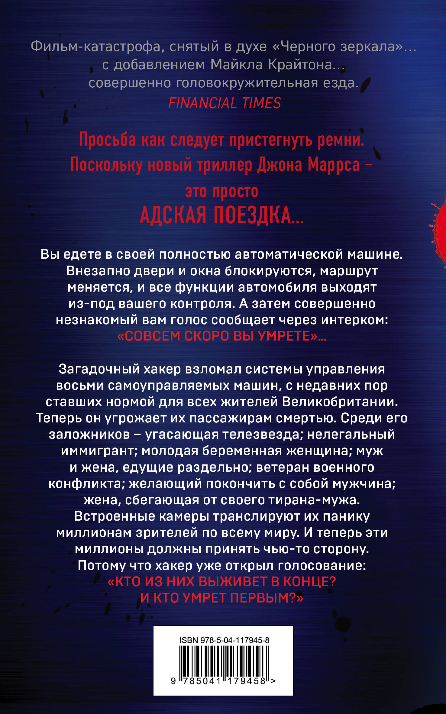 От автора бестселлера «THE ONE. ЕДИНСТВЕННЫЙ». Для фанатов сериала «ЧЕРНОЕ ЗЕРКАЛО». Роман-финалист всероссийской премии «Русский детектив» 2021 года. Просьба как следует пристегнуть ремни. Поскольку новый триллер Джона Маррса - это просто адская поездка… Вы едете в своей полностью автоматической машине. Внезапно двери и окна блокируются, маршрут меняется, и все функции автомобиля выходят из-под вашего контроля. А затем совершенно незнакомый вам голос сообщает через интерком: «Совсем скоро вы умрете»… Восемь автомобилей на встречных курсах. Восемь заранее отобранных жертв. Кто выживет, кто погибнет? Решать вам… Загадочный хакер взломал системы управления восьми самоуправляемых машин, с недавних пор ставших нормой для всех жителей Великобритании. Теперь он угрожает их пассажирам смертью. Среди его заложников - угасающая телезвезда; нелегальный иммигрант; молодая беременная женщина; муж и жена, едущие раздельно; ветеран военного конфликта; желающий покончить с собой мужчина; жена, сбегающая от своего тирана-мужа. Встроенные камеры транслируют их панику миллионам зрителей по всему миру. И теперь эти миллионы должны принять чью-то сторону. Потому что хакер уже открыл голосование: «Кто из них выживет в конце? И кто умрет первым?» -------------------------------------------------- «Провокационно, пугающе и притягивающе. Еще один умнейший триллер из ближайшего будущего». - Кара Хантер «Фильм-катастрофа, снятый в духе "Черного зеркала"… с добавлением Майкла Крайтона… совершенно головокружительная езда». - Financial Times «Маррс поистине блестящ в лихих поворотах сюжета и адреналиновой гонке повествования». - Питер Джеймс «Шок на каждой следующей странице». - Wall Street Journal «Езда на автомобиле… больше не будет ощущаться прежней рутиной». - Los Angeles Times «Маррс сдобрил свой головокружительный сюжет едкой сатирой». - The Washington Post «Маррс способен заинтриговать одновременно и романтиков, и скептиков». - Kirkus Reviews
