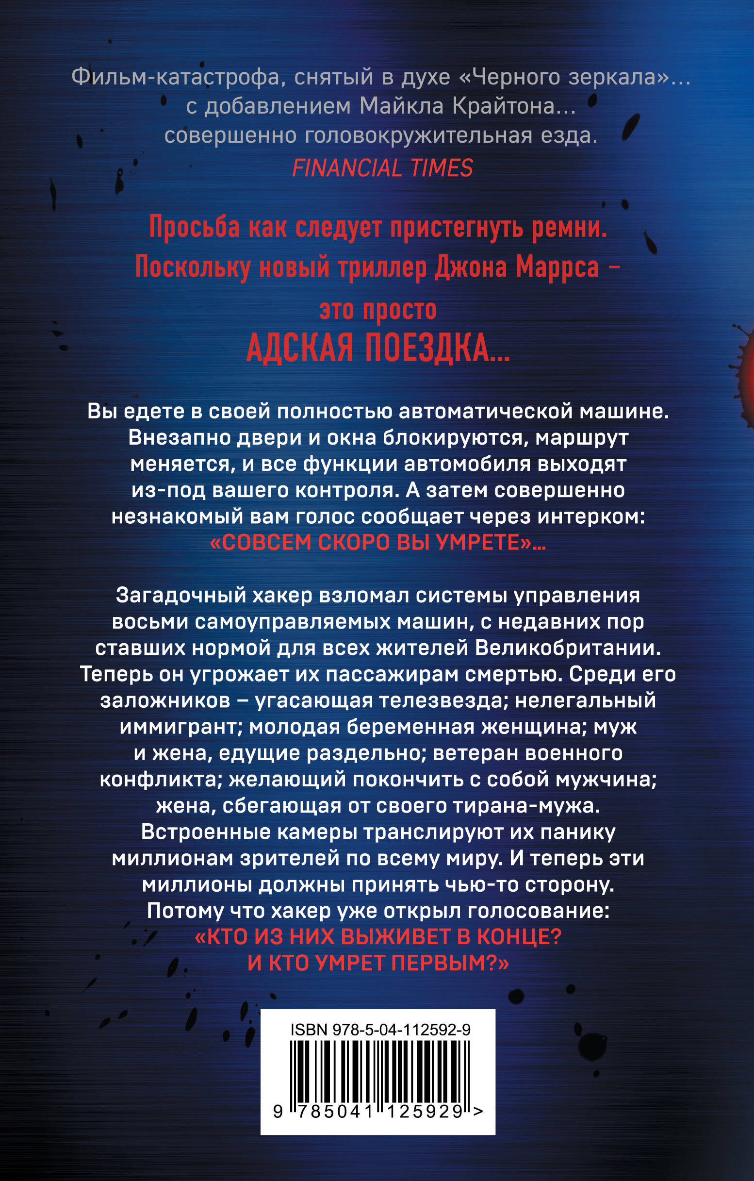 От автора бестселлера «THE ONE. ЕДИНСТВЕННЫЙ». Для фанатов сериала «ЧЕРНОЕ ЗЕРКАЛО». Роман-финалист всероссийской премии «Русский детектив» 2021 года. Просьба как следует пристегнуть ремни. Поскольку новый триллер Джона Маррса - это просто адская поездка… Вы едете в своей полностью автоматической машине. Внезапно двери и окна блокируются, маршрут меняется, и все функции автомобиля выходят из-под вашего контроля. А затем совершенно незнакомый вам голос сообщает через интерком: «Совсем скоро вы умрете»… Восемь автомобилей на встречных курсах. Восемь заранее отобранных жертв. Кто выживет, кто погибнет? Решать вам… Загадочный хакер взломал системы управления восьми самоуправляемых машин, с недавних пор ставших нормой для всех жителей Великобритании. Теперь он угрожает их пассажирам смертью. Среди его заложников - угасающая телезвезда; нелегальный иммигрант; молодая беременная женщина; муж и жена, едущие раздельно; ветеран военного конфликта; желающий покончить с собой мужчина; жена, сбегающая от своего тирана-мужа. Встроенные камеры транслируют их панику миллионам зрителей по всему миру. И теперь эти миллионы должны принять чью-то сторону. Потому что хакер уже открыл голосование: «Кто из них выживет в конце? И кто умрет первым?» -------------------------------------------------- «Провокационно, пугающе и притягивающе. Еще один умнейший триллер из ближайшего будущего». - Кара Хантер «Фильм-катастрофа, снятый в духе "Черного зеркала"… с добавлением Майкла Крайтона… совершенно головокружительная езда». - Financial Times «Маррс поистине блестящ в лихих поворотах сюжета и адреналиновой гонке повествования». - Питер Джеймс «Шок на каждой следующей странице». - Wall Street Journal «Езда на автомобиле… больше не будет ощущаться прежней рутиной». - Los Angeles Times «Маррс сдобрил свой головокружительный сюжет едкой сатирой». - The Washington Post «Маррс способен заинтриговать одновременно и романтиков, и скептиков». - Kirkus Reviews| Издательство | ООО "Издательство "Эксмо" |