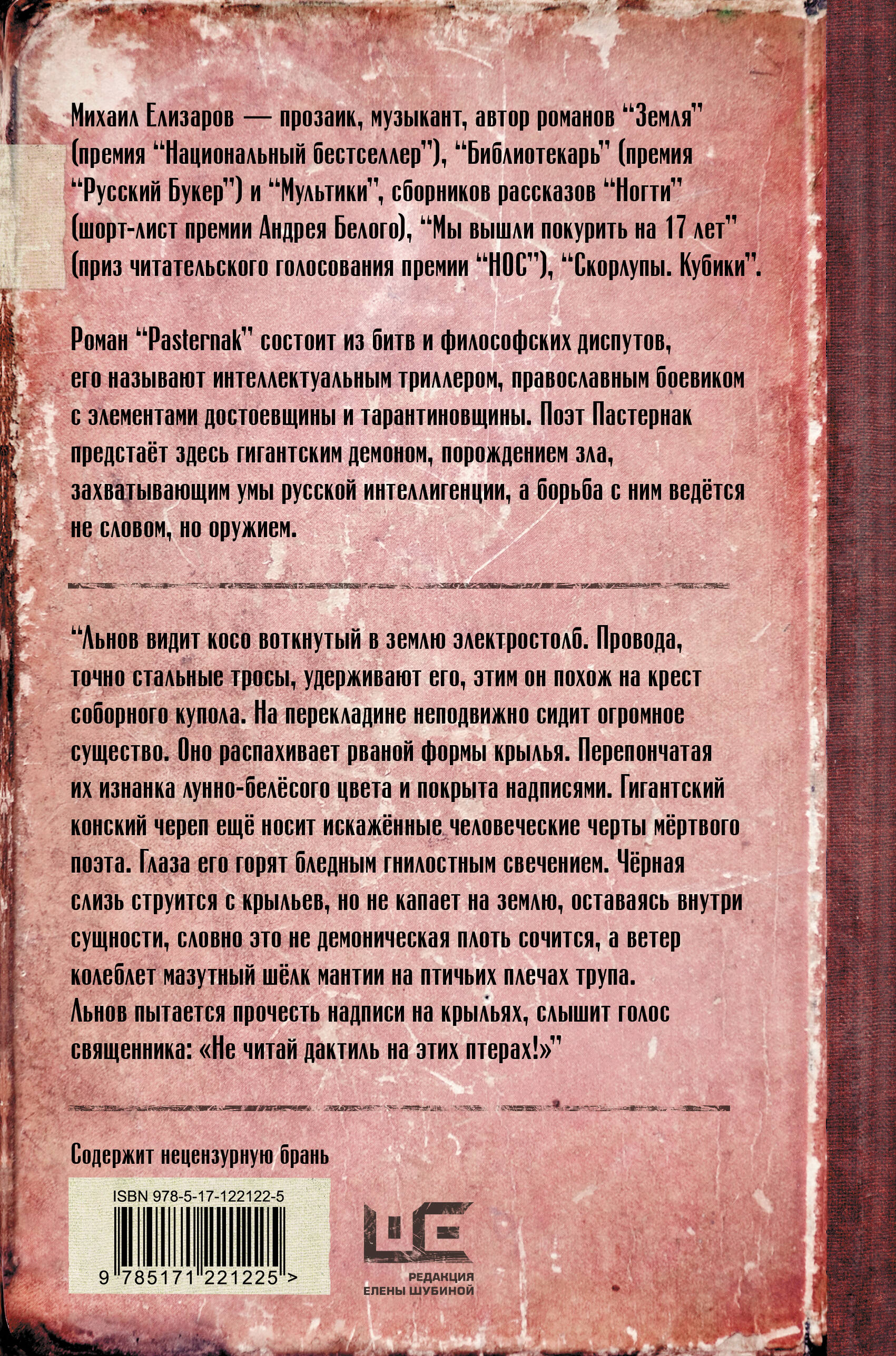 Михаил Елизаров - автор романов "Земля" (премия "Национальный бестселлер"), "Библиотекарь" (премия "Русский Букер") и "Мультики", сборников рассказов "Ногти" (шорт-лист премии Андрея Белого), "Мы вышли покурить на 17 лет" (приз читательского голосования премии "НОС"), "Кубики". Роман "Pasternak" состоит из битв и философских диспутов, его называют интеллектуальным триллером, православным боевиком с элементами достоевщины и тарантиновщины. Поэт Пастернак предстаёт здесь гигантским демоном, порождением зла, захватывающим умы русской интеллигенции, а борьба с ним ведётся не словом, но оружием. "Льнов видит косо воткнутый в землю электростолб. Провода, точно стальные тросы, удерживают его, этим он похож на крест соборного купола. На перекладине неподвижно сидит огромное существо. Оно распахивает рваной формы крылья. Перепончатая их изнанка лунно-белёсого цвета и покрыта надписями. Гигантский конский череп ещё носит искажённые человеческие черты мёртвого поэта. Глаза его горят бледным гнилостным свечением. Чёрная слизь струится с крыльев, но не капает на землю, оставаясь внутри сущности, словно это не демоническая плоть сочится, а ветер колеблет мазутный шёлк мантии на птичьих плечах трупа. Льнов пытается прочесть надписи на крыльях, слышит голос священника: "Не читай дактиль на этих птерах!""