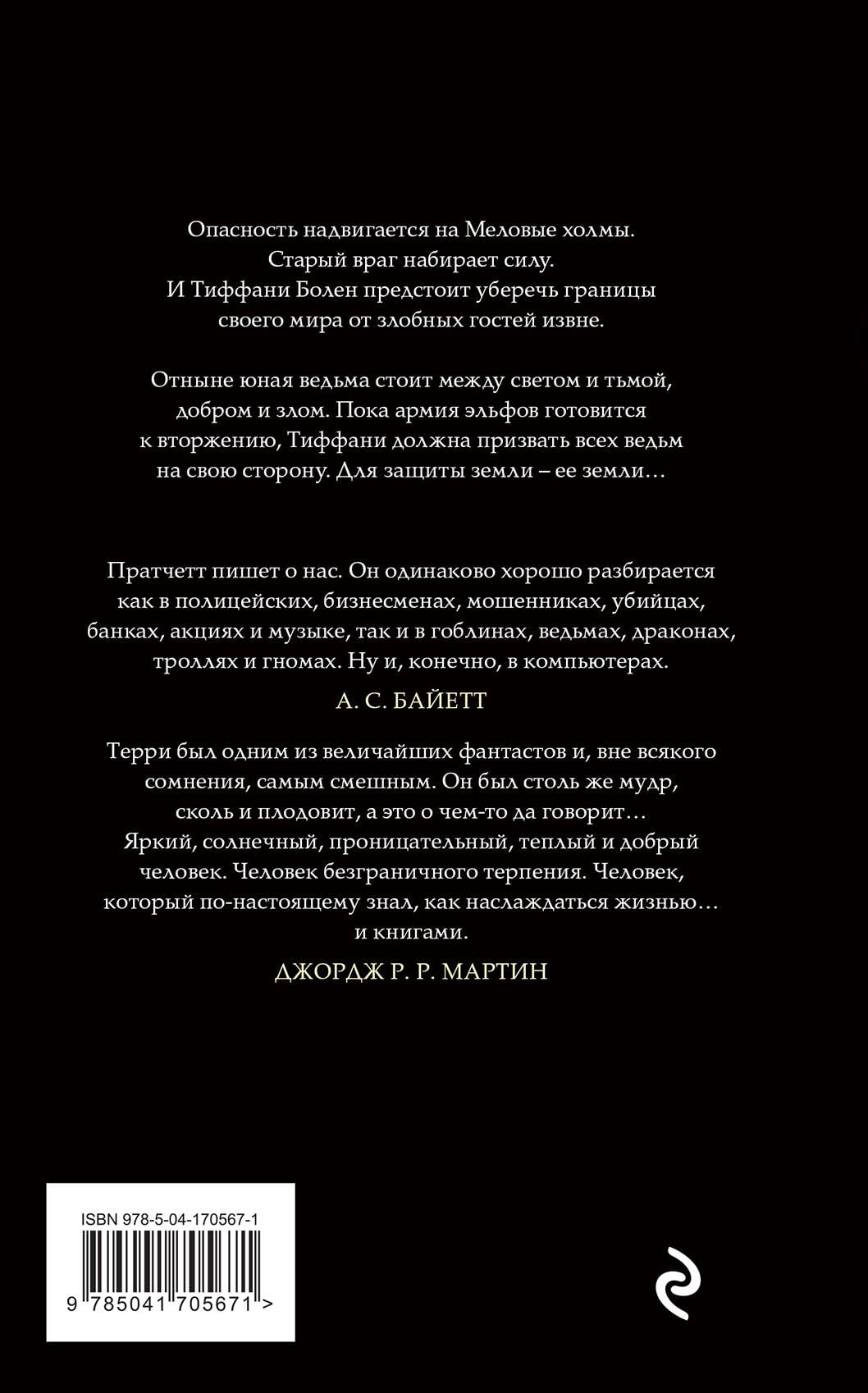 Опасность надвигается на Меловые холмы. Старый враг набирает силу. На плечи Тиффани Болен ложится тяжкое бремя: ей придётся не только проститься с любимой наставницей, но и уберечь границы своего мира от злобных гостей извне. Это время конца и начала, старых друзей и новых, стирания границ и смены власти. Отныне юная ведьма стоит между светом и тьмой, добром и злом. И пока армия эльфов готовится к вторжению, Тиффани должна призвать всех ведьм на свою сторону. Для защиты земли - её земли… Впервые в культовом черном оформлении - пятая книга о Тиффани Болен, завершающая не только серию о приключениях юной ведьмы, но и весь цикл «Плоский мир» сэра Терри Пратчетта.