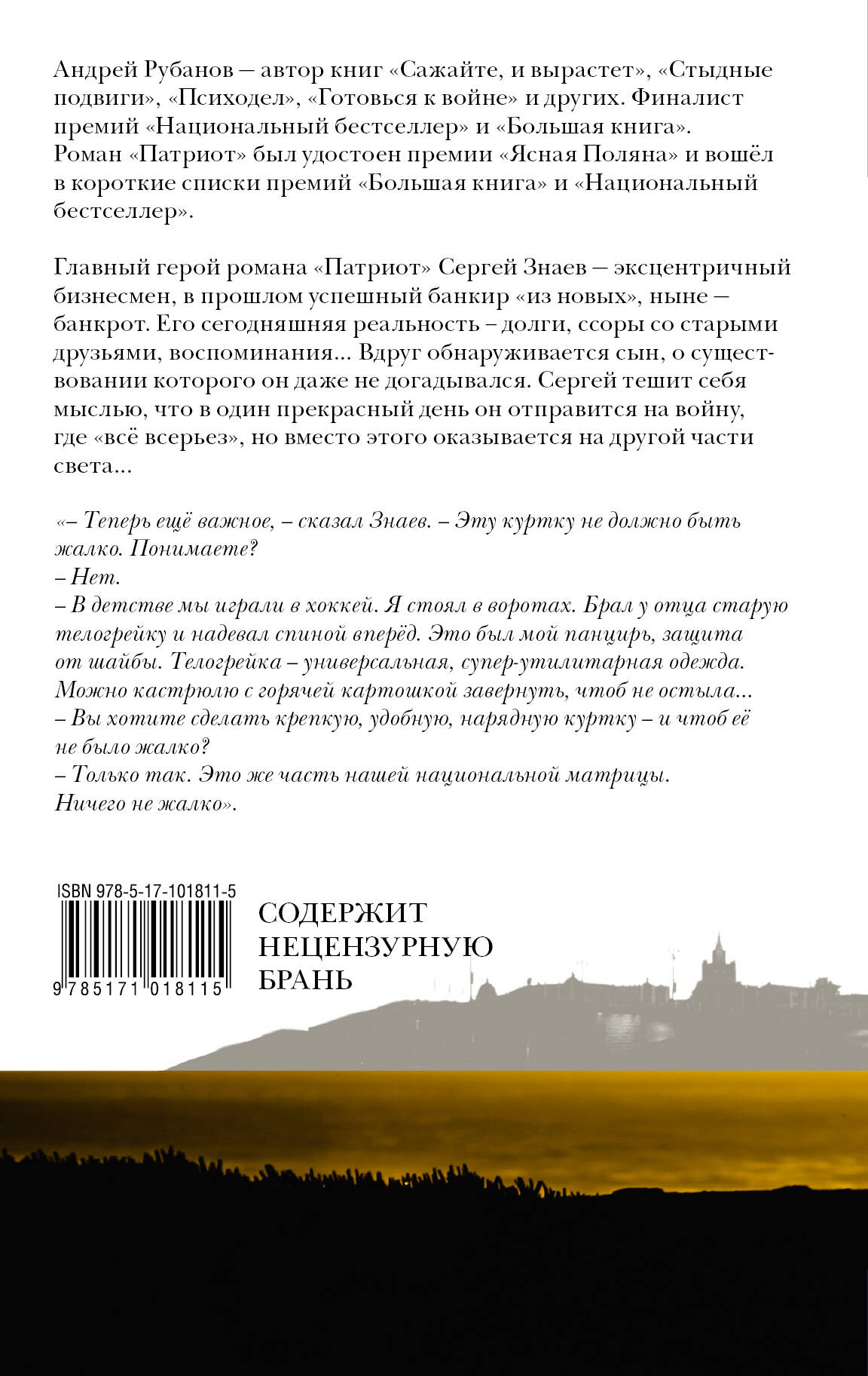 Андрей Рубанов - автор книг "Сажайте, и вырастет", "Стыдные подвиги", "Психодел", "Готовься к войне" и других. Финалист премий "Национальный бестселлер" и "Большая книга". Главный герой романа "Патриот" Сергей Знаев - эксцентричный бизнесмен, в прошлом успешный банкир "из новых", ныне - банкрот. Его сегодняшняя реальность - долги, ссоры со старыми друзьями, воспоминания… Вдруг обнаруживается сын, о существовании которого он даже не догадывался. Сергей тешит себя мыслью, что в один прекрасный день он отправится на войну, где "всё всерьез", но вместо этого оказывается на другой части света…| Издательство | ИЗДАТЕЛЬСТВО "АСТ" |