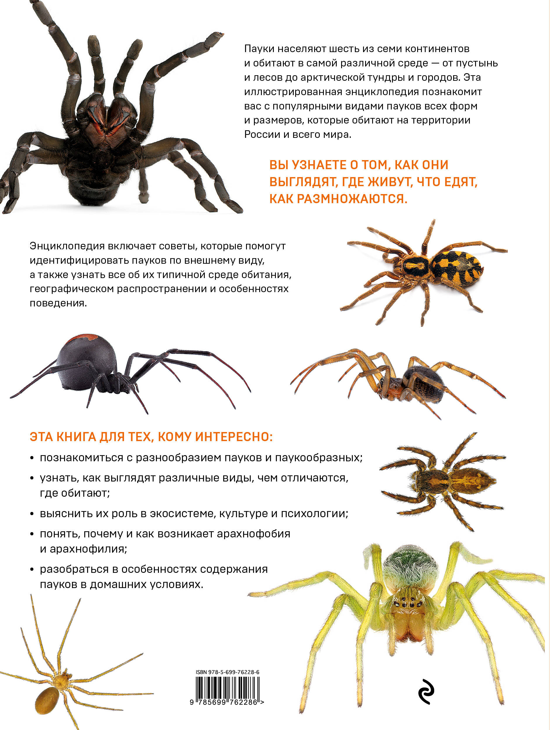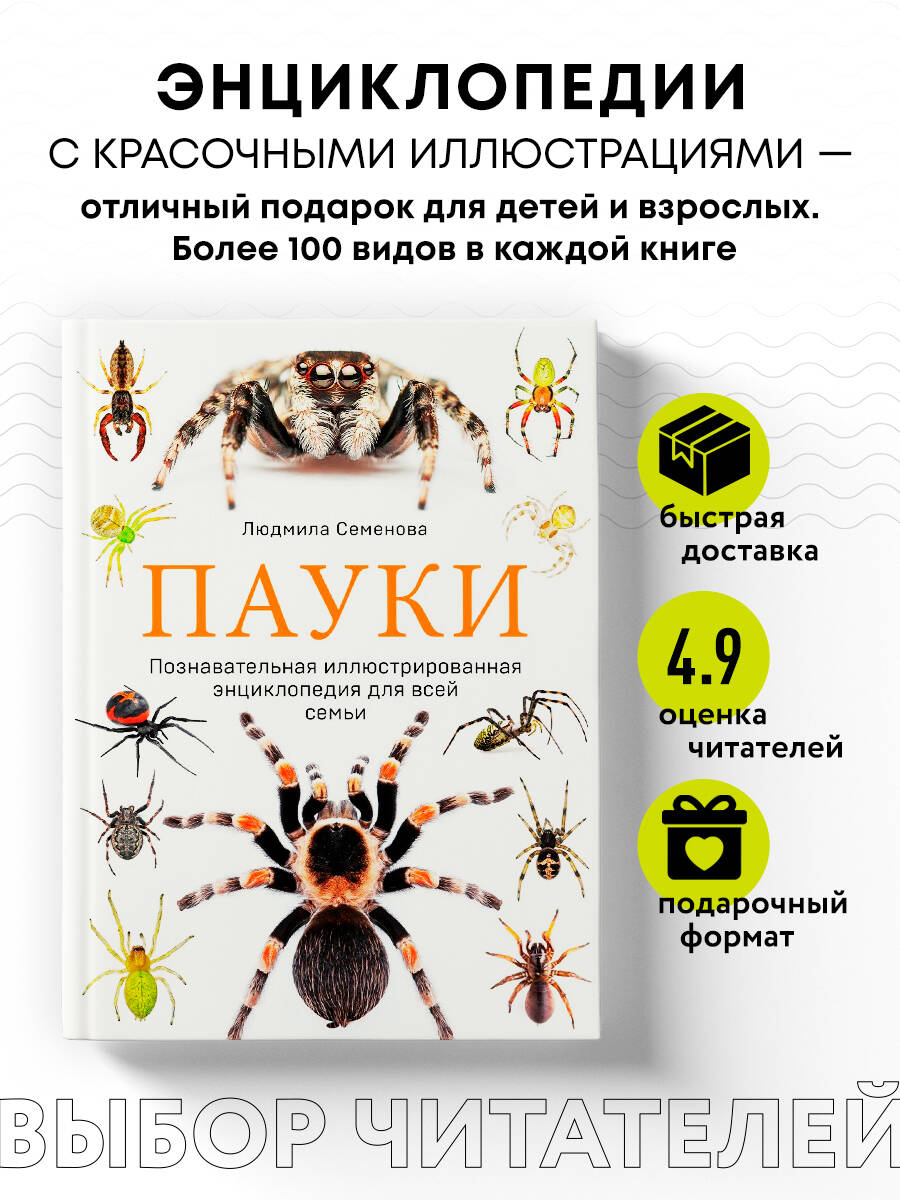 Пауки населяют шесть из семи континентов и обитают в самой различной среде - от пустынь и лесов до арктической тундры и городов. Эта иллюстрированная энциклопедия познакомит вас с популярными видами пауков всех форм и размеров. Вы узнаете о том, как они выглядят, где обитают, что едят, как размножаются. Несмотря на то что у многих внешний вид пауков вызывает ужас, есть те, кто увлекается паукообразными и исследует их. Эта книга для тех, кому интересно: - познакомиться с разнообразием пауков и паукообразных; - узнать, как выглядят различные виды, чем отличаются, где обитают; - выяснить их роль в экосистеме, культуре и психологии; - понять, что такое и как возникает арахнофобия и арахнофилия; - разобраться в особенностях содержания пауков в домашних условиях.
