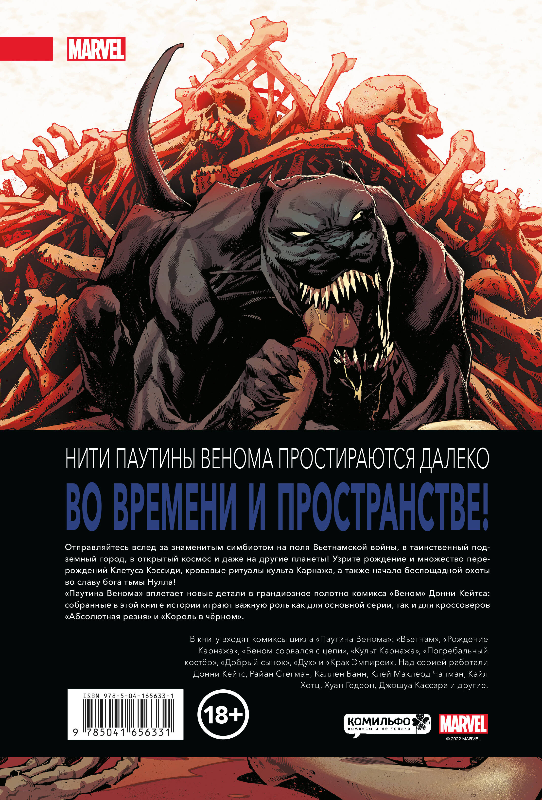 «Паутина Венома» вплетает новые детали в грандиозное полотно комикса «Веном» Донни Кейтса: собранные в этой книге истории играют важную роль как для основной серии, так и для кроссоверов «Абсолютная резня» и «Король в чёрном».