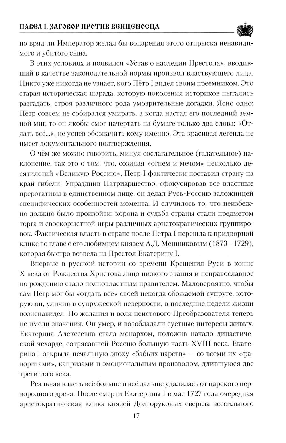 Император Павел I - фигура трагическая и оклеветанная; недаром его называли «Русским Гамлетом». Этот Самодержец давно должен занять достойное место на страницах истории Отечества, где его имя все еще затушевано различными бездоказательными тенденциозными измышлениями. Исторический портрет Павла I необходимо воссоздать в первозданной подлинности, без всякого идеологического налета. Его правление, бурное и яркое, являлось важной вехой истории России, и трудно усомниться в том, что если бы не трагические события 11-12 марта 1801 года, то история нашей страны развивалась бы во многом совершенно иначе.| Издательство | Вече |