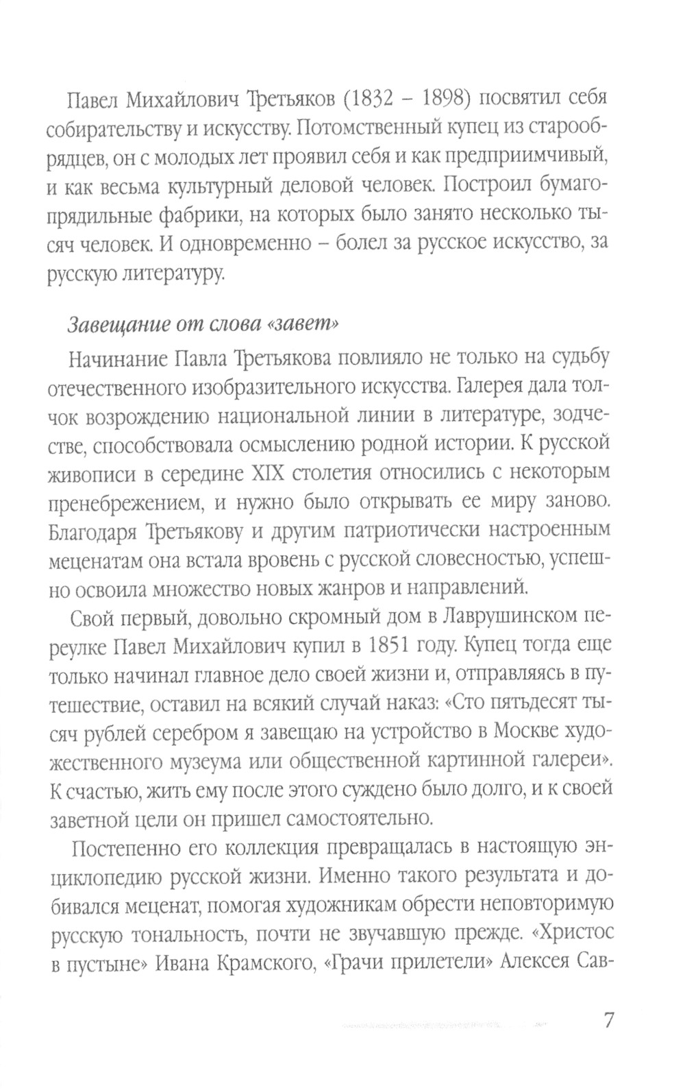 Третьяковская галерея для России - это больше, чем просто собрание картин. Это душа народа и осмысление его истории. "От вас крупное имя и дело останется", - говорил Павлу Третьякову Владимир Стасов. Эта книга раскрывает судьбу Третьякова и его великого детища, главной галереи всея Руси, которая носит имя своего создателя - крупнейшего меценат в истории русского искусства.