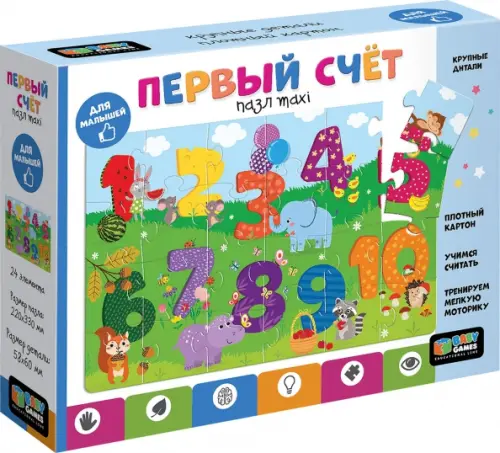 Пазл 24 элемента - это отличный подарок для любого ребенка! Сборка пазла поможет развить внимательность и мелкую моторику, а также легко и просто научиться считать до десяти! Крупные детали из толстого картона удобно ложатся в маленькие ручки. Учитесь считать вместе с Baby Games.