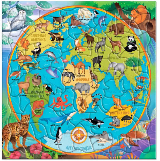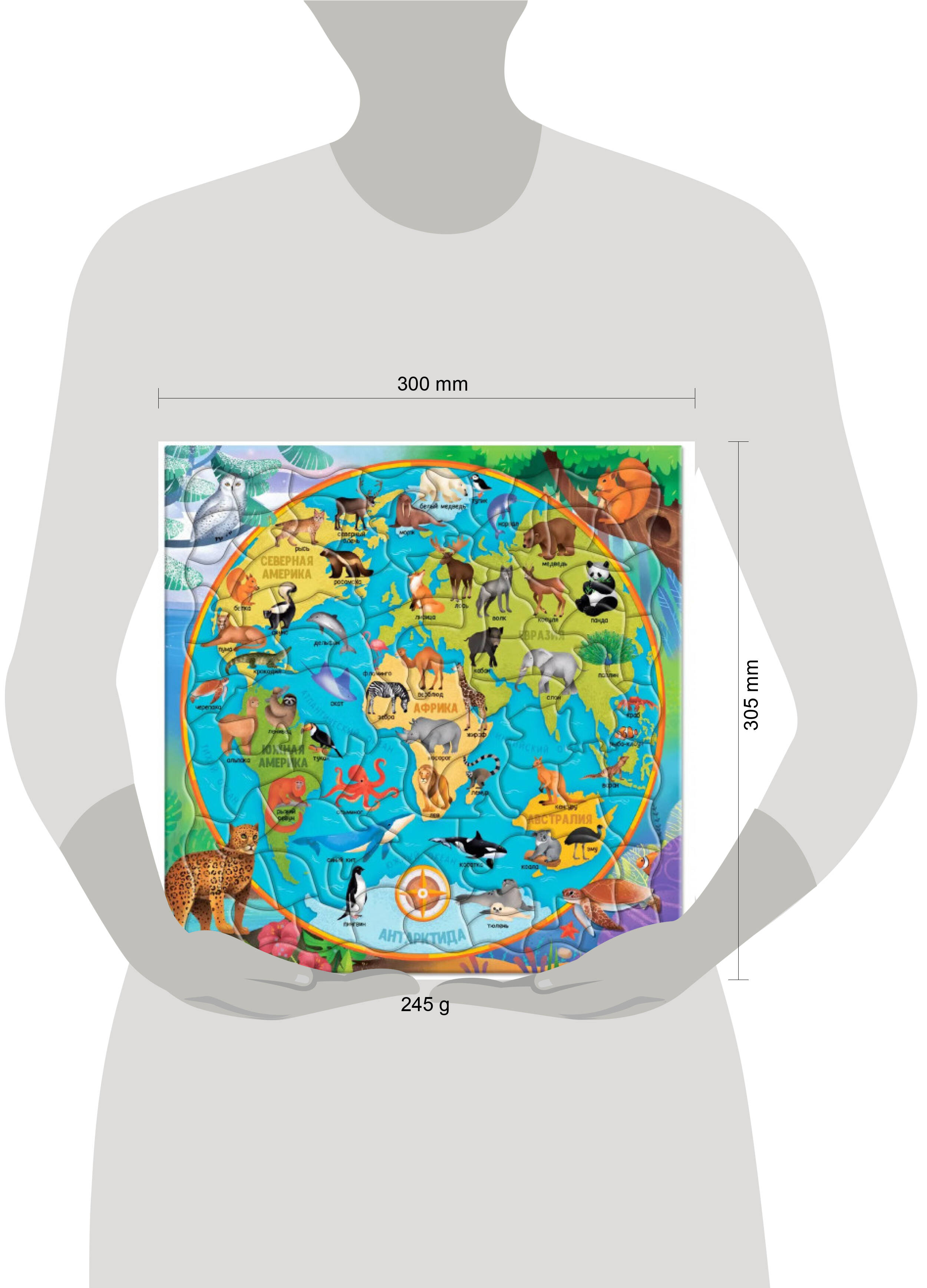 Аннотация: Пазл фигурный на подложке. 80 деталей. Карта мира. Животные. 30х30,5 см. ГЕОДОМ
