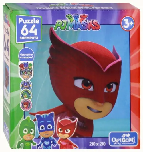 Какому ребенку не захочется иметь удивительные сверхспособности, и почувствовать себя защитником правопорядка?! PJ Masks - это трое неразлучных друзей, которые днем ходят в школу, общаются с одноклассниками, делают домашние задания, а вечером надевают свои костюмы и превращаются в супергероев. Мы предлагаем отправиться навстречу приключениям вместе с PJ Masks, а пазлы 64 элемента станут отличным воспоминанием!.