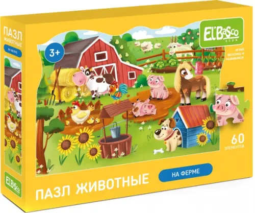 На ферме всегда есть чем заняться! Вот и наши герои не отстают - козлик щипает капусту, кот исследует свою территорию, поросята резвятся в лужице грязи, а щенок отважно сторожит свою косточку. Интересный и яркий пазл станет самым занимательным детским увлечением. В процессе собирания пазлов у малыша будут развиваться зрительное восприятие, логическое мышление, внимательность, усидчивость, мелкая моторика рук. Пазл серии "Животные" выполнены из легкого, но в то же время прочного и износоустойчивого картона. Каждый пазл серии состоит из 60 элементов.
