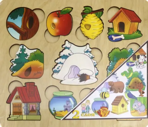 Вкладыши в игре сложной формы и поэтому подбирать для них места на доске занятие не самое простое. Для начала можно не вынимать животных и предложить ребенку спрятать каждого из них в свой домик. Таким образом малыш будет находить место для вкладыша не по форме, а по смыслу. Когда ребенок поймет принцип игры, можно вынуть все вкладыши и дать ему самостоятельно заполнить все отверстия. В ходе занятий с доской Где чей домик ребенок, с одной стороны, познакомится с названиями животных и насекомых, узнает, как называются их домики, а, с другой стороны, потренирует мелкую моторику рук и глазомер.